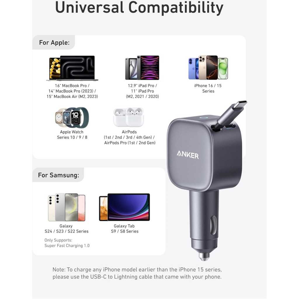 Key Features: Full-Throttle 75W USB-C Charging: Power up rapidly with a charger that delivers up to 75W, giving you super-fast charging when you need it most. Dual-Device Power Delivery: Experience rapid charging with the built-in 45W Power Delivery retractable cable and 30W USB-C port, perfect for powering up laptops and tablets together without slowing down. Pull, Charge, and Store: Extend by pulling the retractable cable more than 2 inches. Retract swiftly with a short pull and release. Keep Your Car Organized: Drive in style with a clutter-free charger that keeps your car’s interior neat and orderly. What You Get: Anker Nano Car Charger (75W, USB-C Port, Built-In Retractable USB-C Cable), welcome guide, 18-month warranty, and our friendly customer service.