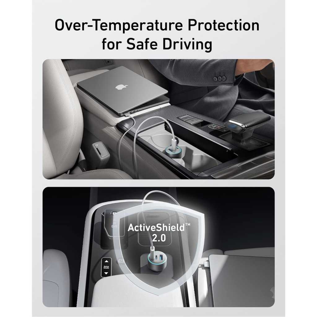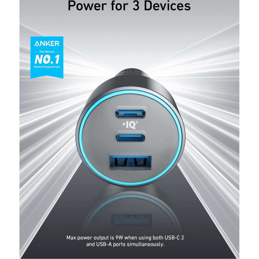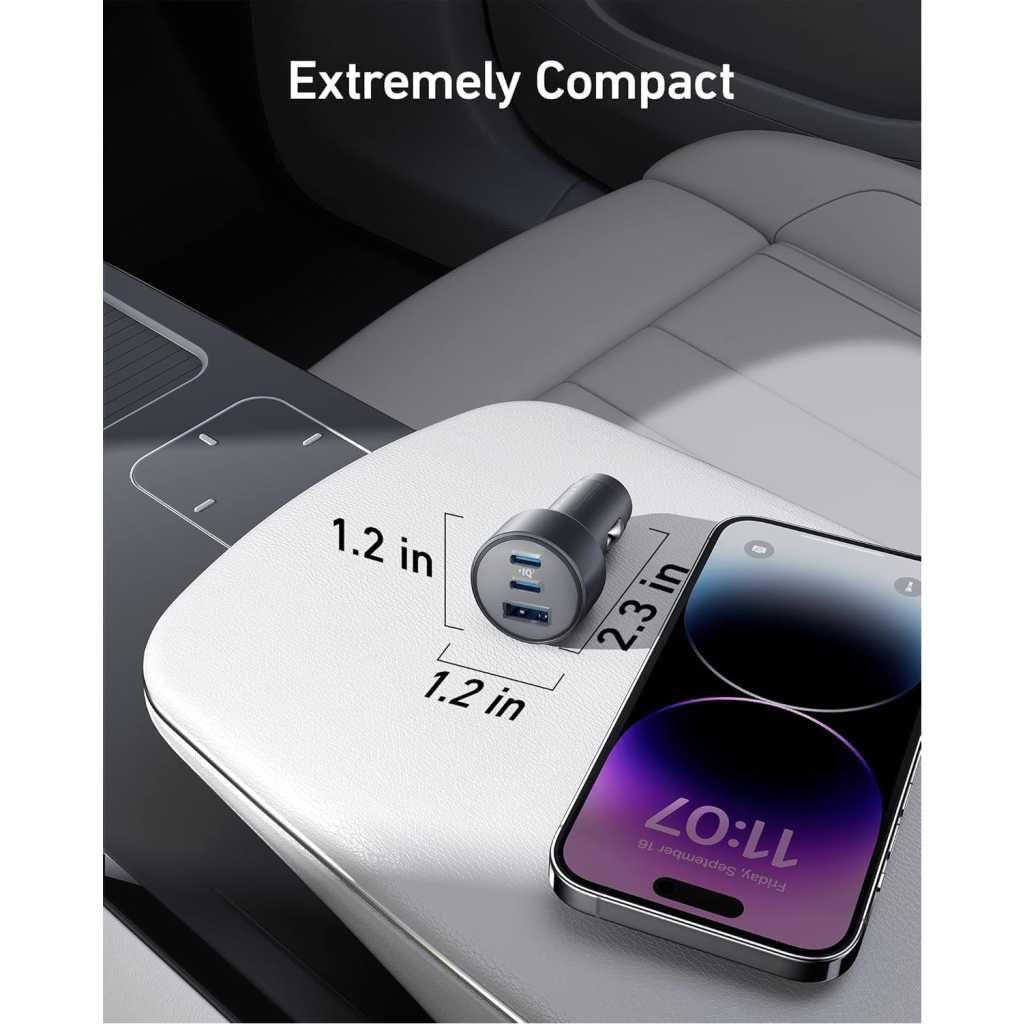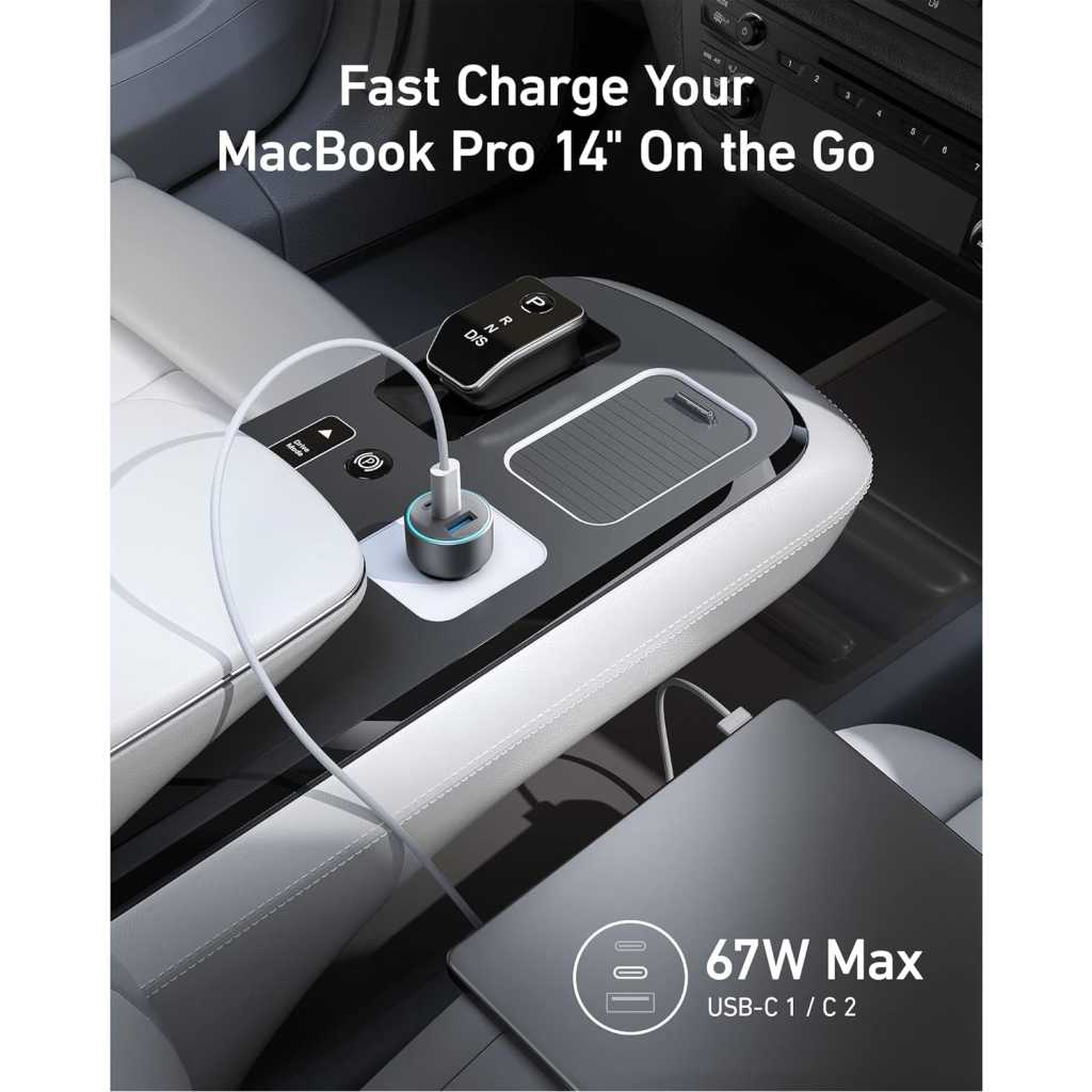Key Features: Simultaneous Charging: Charge up to three devices at once with a total output of 67W using the two USB-C ports and one USB-A port. When all three devices are connected, the USB-C 1 port delivers 45W of power through PPS / PD charging. High-Speed USB-C Charging: A 67W PowerIQ 3.0 USB-C port provides full-speed charging to USB-C laptops including the MacBook Pro 14″. Ultra-Compact: The small and compact car charger, measuring just 2.3 × 1.2 × 1.2 inches, makes it the perfect travel companion for non-stop power on the road. ActiveShield 2.0 Safety System: Provides continuous temperature monitoring and output control to protect your connected device, so you can rest easy while driving. What You Get: Anker Car Charger (67W), 3.2 ft (97.53 cm) USB-C to USB-C cable, welcome guide, our worry-free 18-month warranty, and friendly customer service.