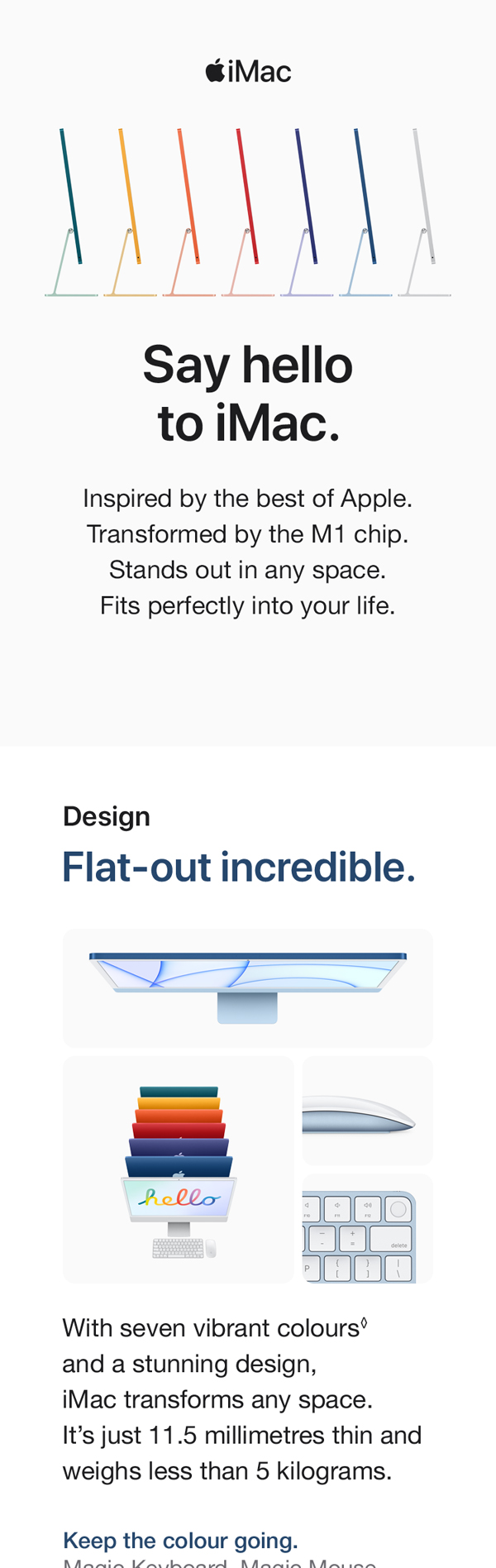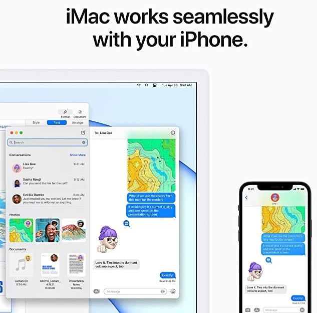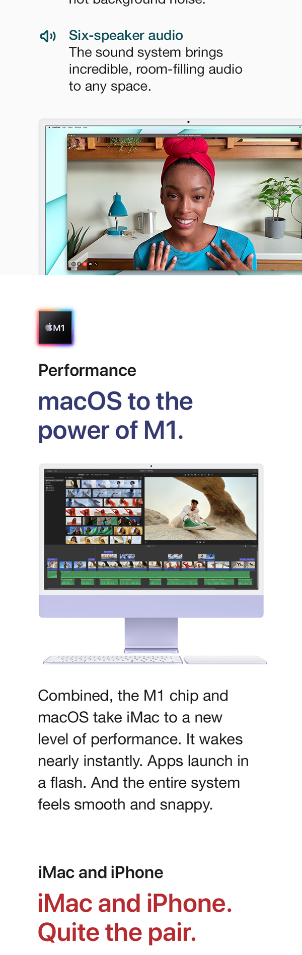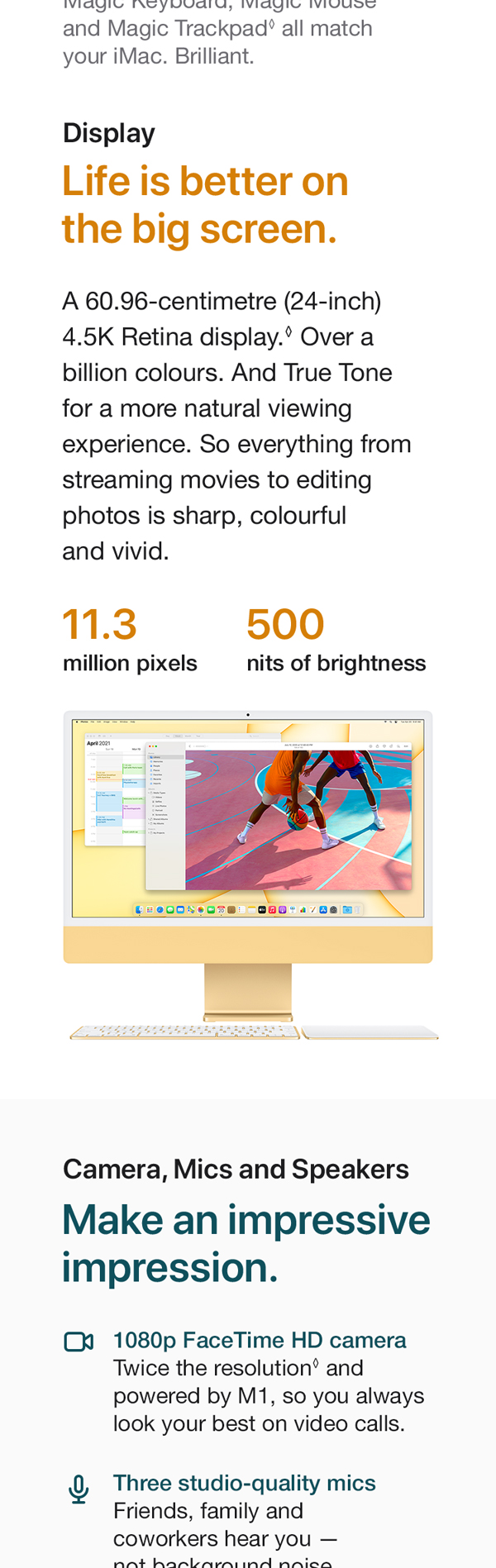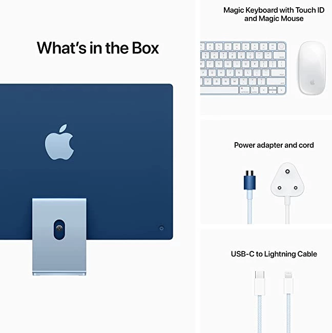 You’ve never seen a computer like this before. With a strikingly thin design made possible by the Apple M1 chip. An immersive 60.96 cm (24-inch) 4.5K Retina display with over a billion colors that gives you the big picture in stunning detail. The best camera and mics ever in a Mac so you look and sound your best. And room-filling, six-speaker sound that takes movies and music to the next level. It works seamlessly with iPhone so texts and calls go right to your iMac. And with a spectrum of colors to choose from, it’s the all-in-one that’s all yours. From the manufacturer