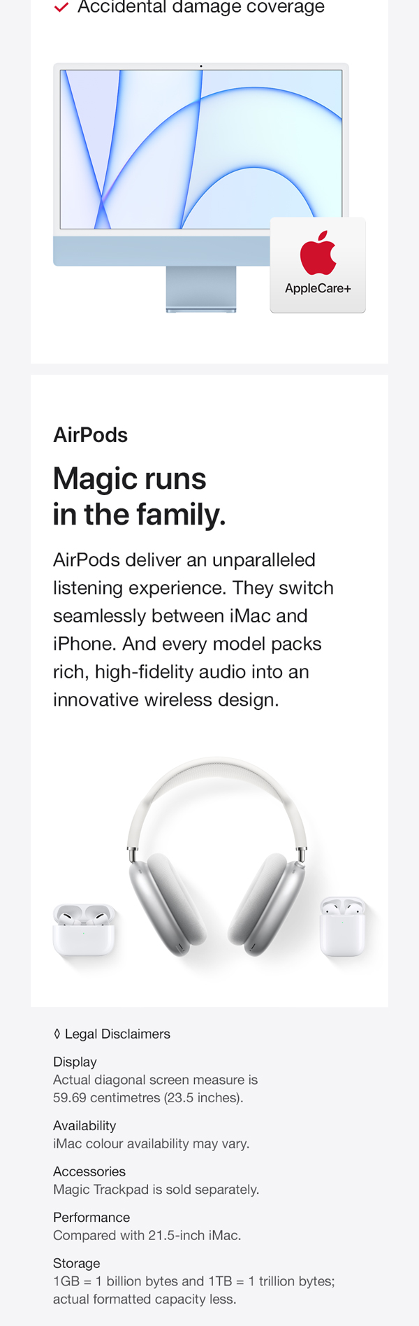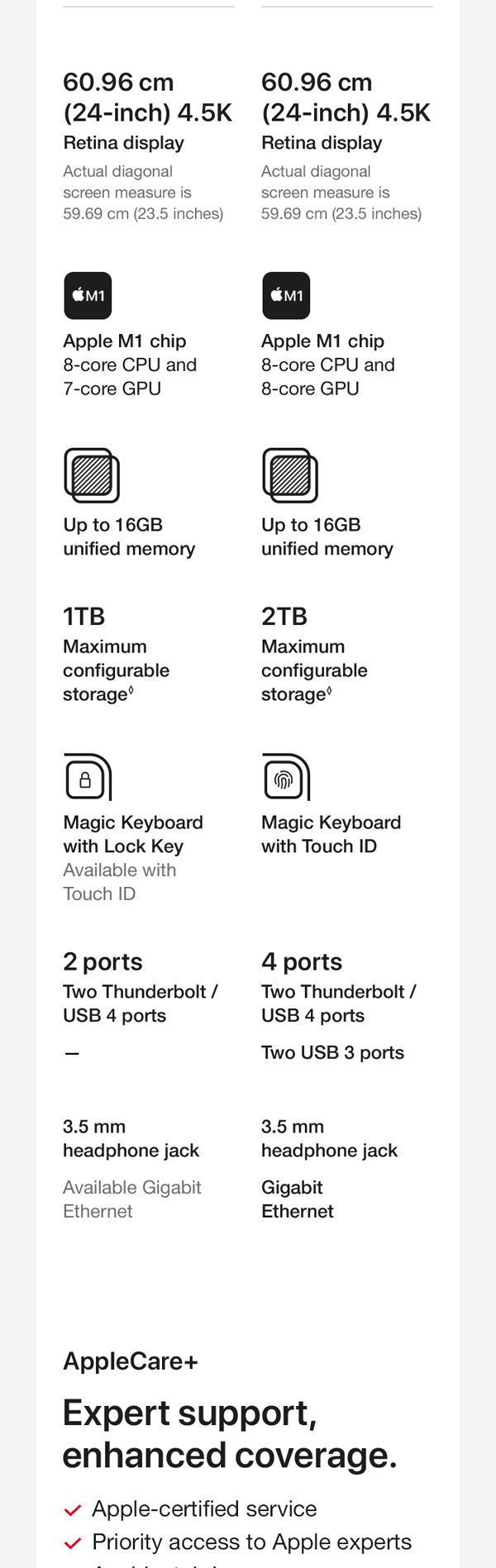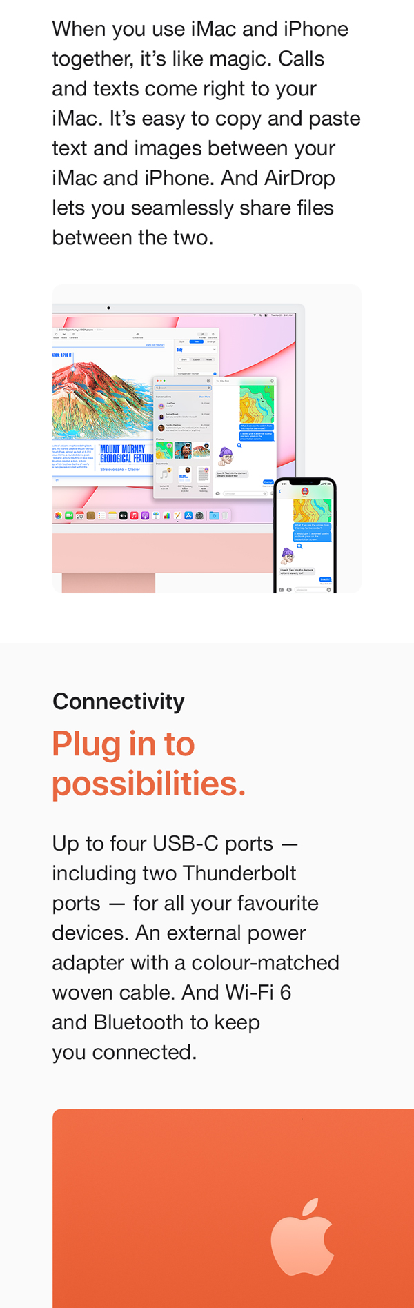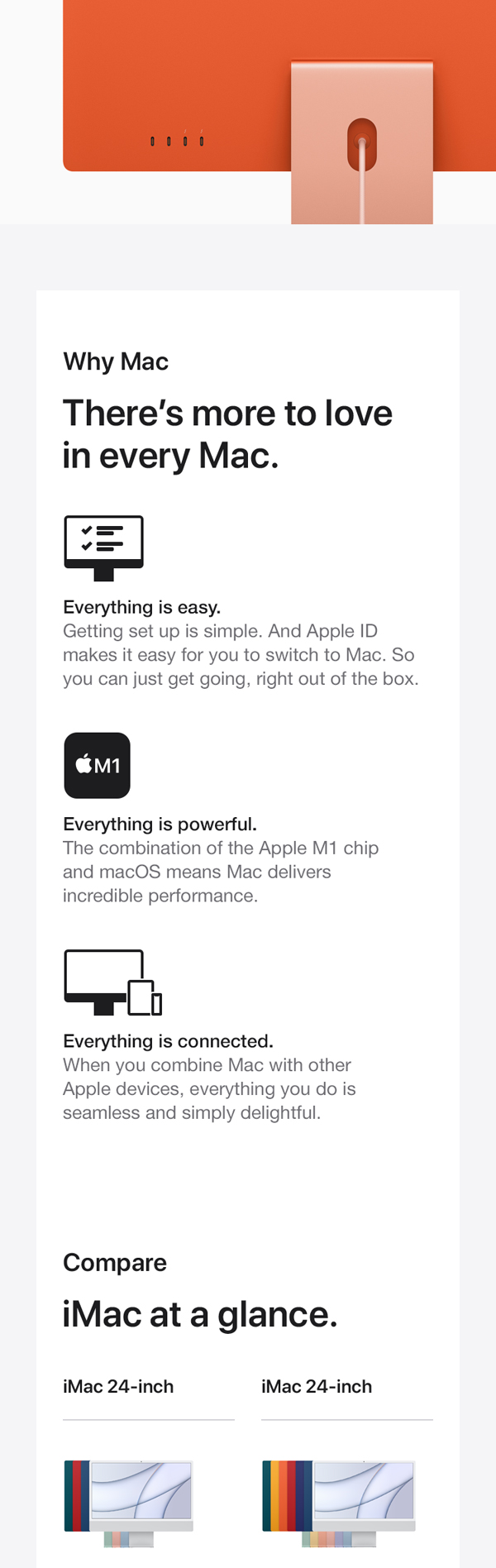 You’ve never seen a computer like this before. With a strikingly thin design made possible by the Apple M1 chip. An immersive 60.96 cm (24-inch) 4.5K Retina display with over a billion colors that gives you the big picture in stunning detail. The best camera and mics ever in a Mac so you look and sound your best. And room-filling, six-speaker sound that takes movies and music to the next level. It works seamlessly with iPhone so texts and calls go right to your iMac. And with a spectrum of colors to choose from, it’s the all-in-one that’s all yours. From the manufacturer