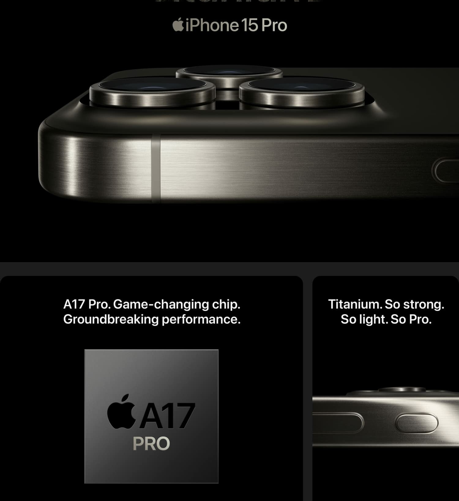 Key Features: NETWORK Technology: GSM / CDMA / HSPA / EVDO / LTE / 5G SIM: Nano-SIM Dual SIM (Nano-SIM, dual stand-by) – China Size: 6.7 inches PLATFORM: OS iOS 17, upgradable to iOS 17.0.3 Chipset Apple A17 Pro (3 nm) Internal: 1TB 8GB RAM MAIN CAMERA: Triple 48 MP COMMS: WLAN Wi-Fi 802.11 a/b/g/n/ac/6e, dual-band, hotspot USB: USB Type-C 3.2 Gen 2, DisplayPort BATTERY Type: Li-Ion 4441 mAh, non-removable