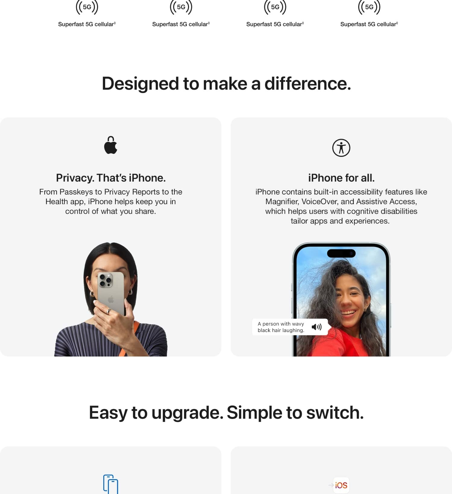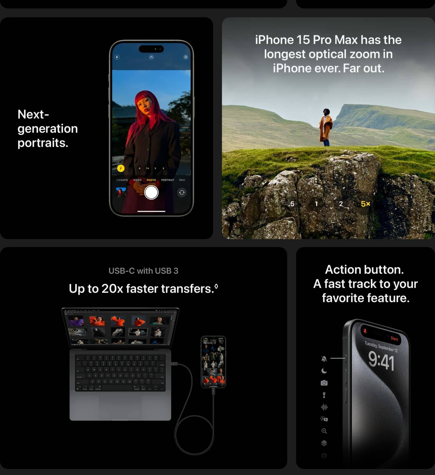 Product Details Key Features: NETWORK Technology: GSM / CDMA / HSPA / EVDO / LTE / 5G SIM: Nano-SIM/ Single SIM Dual SIM (Nano-SIM, dual stand-by) – China Size: 6.1 inches, 91.3 cm2 (~88.2% screen-to-body ratio) PLATFORM: OS iOS 17, upgradable to iOS 17.0.3 Internal: 256GB 8GB RAM MAIN CAMERA: Triple: 48 MP COMMS: WLAN Wi-Fi 802.11 a/b/g/n/ac/6e, dual-band, hotspot Bluetooth: 5.3, A2DP, LE USB: USB Type-C 3.2 Gen 2, DisplayPort BATTERY Type: Li-Ion 3274 mAh, non-removable