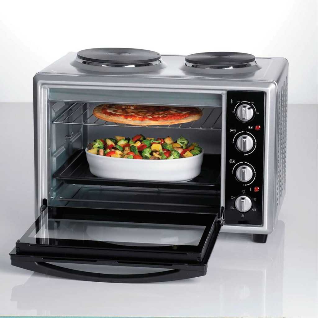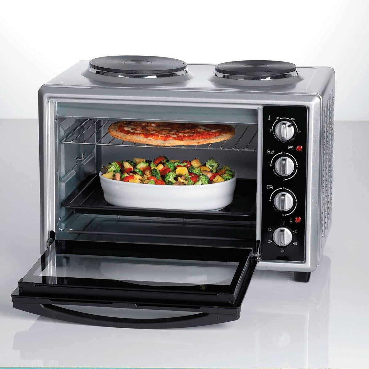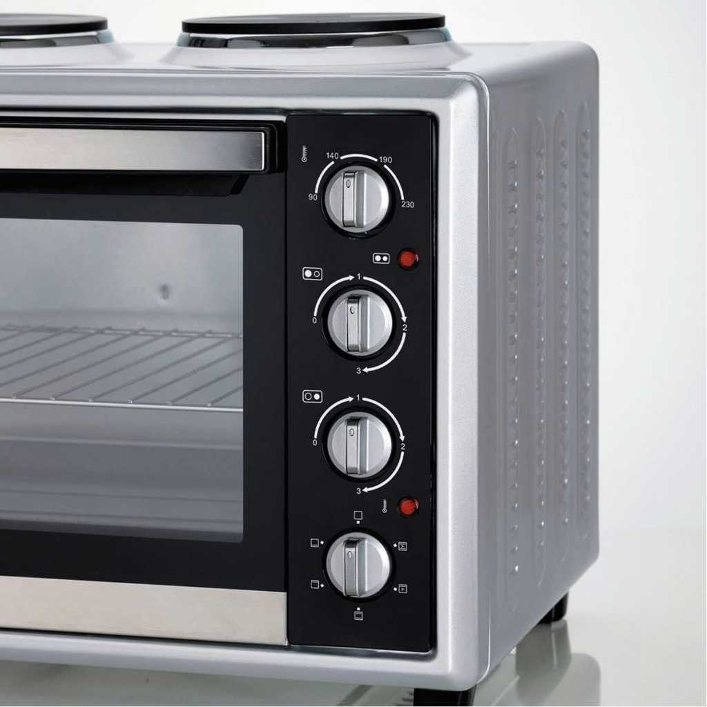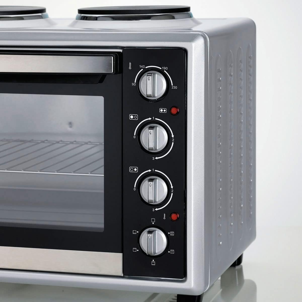 Key Features: Power oven 1500W – Capacity 40L Power small hotplate 750W – Power big hotplate 1000W Total power 3250 W Both hot plates can work together with oven Both hot plates can be adjusted by power level