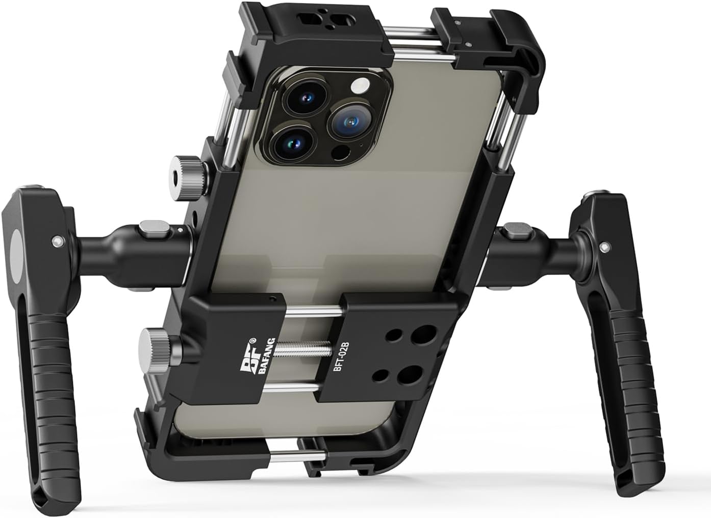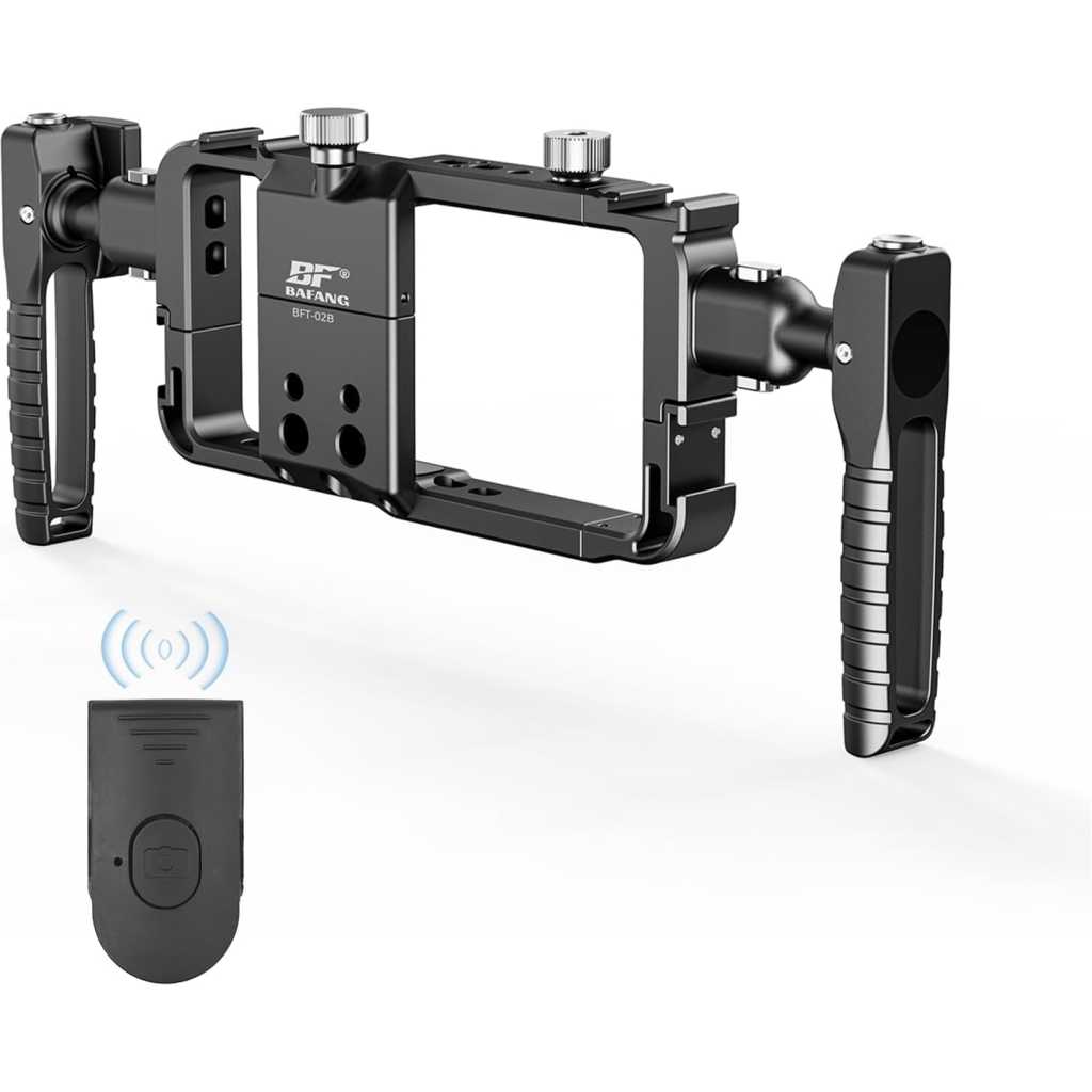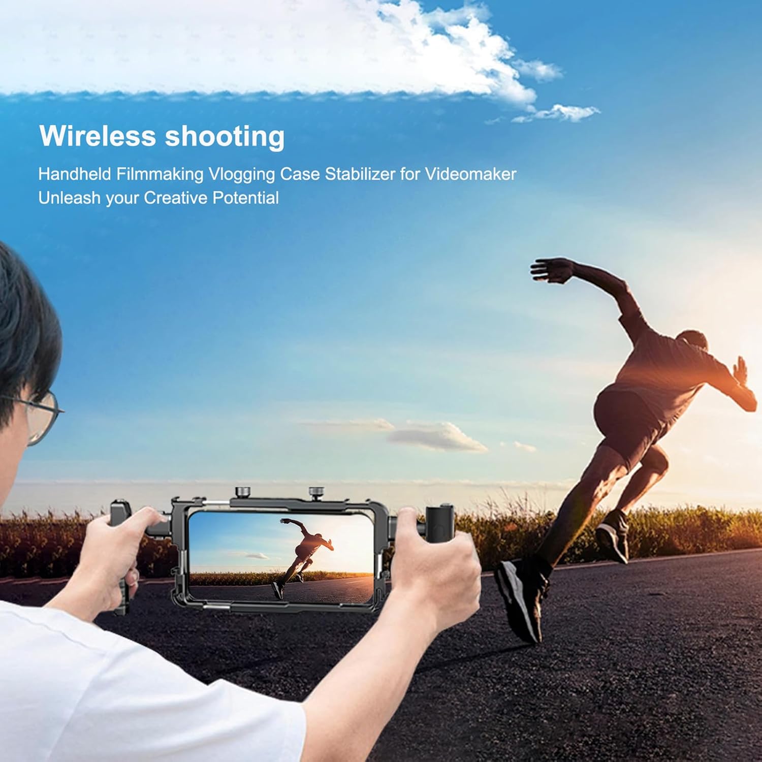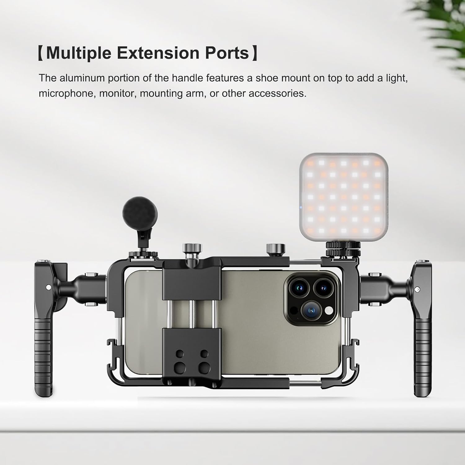 Key Features: [UNIVERSAL PHONE CAGE]: Designed for smartphones 58-90mm wide, providing a comfortable handheld video recording experience. [DUAL HANDLES DESIGN]: Record smooth videos easily with detachable side handles for added stability. [PROTECTIVE SILICONE PADS]: Anti-slip coverings prevent phone falls and scratches, ensuring device safety. [MULTIPLE EXTENSION PORTS]: Four cold shoe mounts allow for customization with various accessories like LED lights and microphones. [PREMIUM ALUMINUM ALLOY]: High-quality material with double-layer anti-slip design for durability and professional video recording.