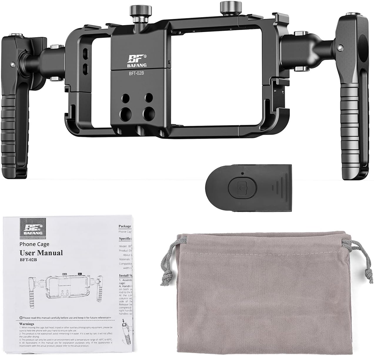 Universal Phone Cage: The phone cage designed for smartphones with a width of 58-90mm, can provide a comfortable and weight handheld video recording experience. Dual Handles Design: Comes with dual side handles, you can use this phone cage to record smooth vid stably and easily. And the side handle can be detached and used as a handle conveniently. With ive Silicone Pads: The phone video cage has -slip silicone coverings to the phone from falling off and it from scratch. Mulle Extension Ports: The phone video rig has four cold shoe mounts that allows you to add a LED fill , microphone, monitor or other accessories to make your video recording more professional. Premium Aluminum Alloy: The phone video cage is made of high-quality aluminum alloy material with a -Layer -slip design, processed by precision machining and anodized hard. Features: Universal Phone Cage: The phone cage designed for smartphones with a width of 58-90mm, can provide a comfortable and weight handheld video recording experience. Dual Handles Design: Comes with dual side handles, you can use this phone cage to record smooth vid stably and easily. And the side handle can be detached and used as a handle conveniently. With ive Silicone Pads: The phone video cage has -slip silicone coverings to the phone from falling off and it from scratch. Mulle Extension Ports: The phone video rig has four cold shoe mounts that allows you to add a LED fill , microphone, monitor or other accessories to make your video recording more professional. Premium Aluminum Alloy: The phone video cage is made of high-quality aluminum alloy material with a -Layer -slip design, processed by precision machining and anodized hard. Specifications: Color: Black Material: Aluminum Alloy Compatible Phone Width: 58-90mm Package List: 1 * Phone Cage 2 * Handles 1 * Remote Shutter 1 * User Manual