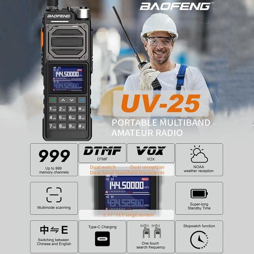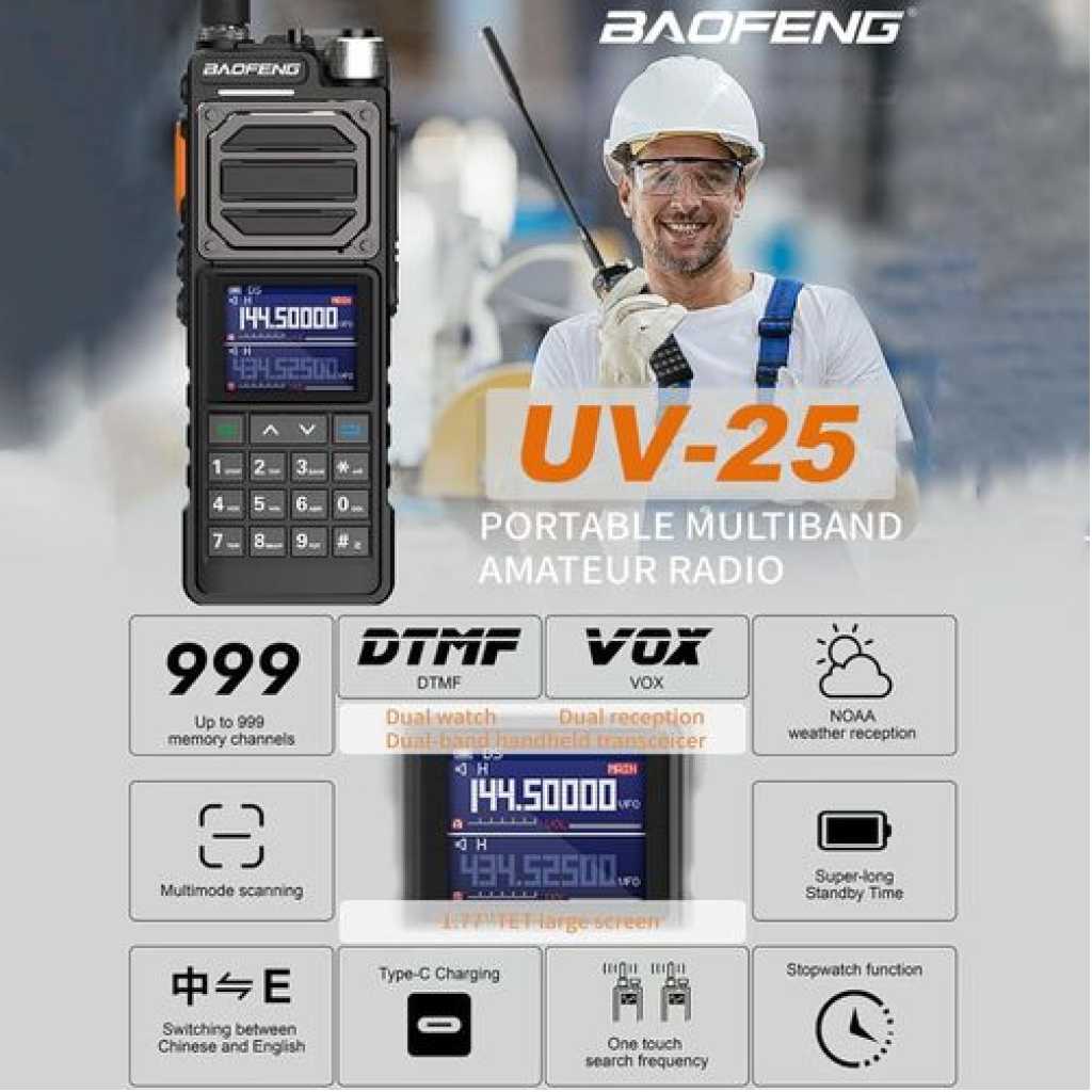 Report Item / Suspicious Activity Tri-Band Frequency FM VHF: 144-148MHz UHF:420-450MHz Quickly copy frequency in a short period of time,making it more convenient and efficient. Type-C charging is a trend for mobile devices as it has low requirements for power sources and places. The UV-25 is Type-C USB rechargeable, for which you can easily charge it like a phone in your car, with a power bank or laptop. Portable for your go-kit. Apart from programming the radio via computer software, users can also use the keypad to program most settings in the menu, for example,adding/deleting a memory channel,adding/removing a channel from the scanning list, adjustingv VOX/squelch/power save levels, etc Compatible with SMA-Female antenna(Especially with ABBREE tactical antenna will be better. Compatible with K-port (2 Pin) headset, speaker mic, programming cable. Various placeswidely Used,Outdoor/Engineering/warehousing/LogisticsNew choices in the service industry 1 year warranty provided only through “Shiqun Electronics Co., Ltd”. If you have any problems with compatible models, please feel free to reach out. Specifications Model Number:UV-25 Output Power(w): 9-10w Battery Capacity(mAh): High Capacity Waterproof: IP45 Material: Plastic Storage Channel: 999 channels Range: 10km Dimensions: 180mm x 70mm x 45mm Display: 1.77inch Color Large Screen Display. Brand Name: BAOFENG Walkie Talkie Type: Portable