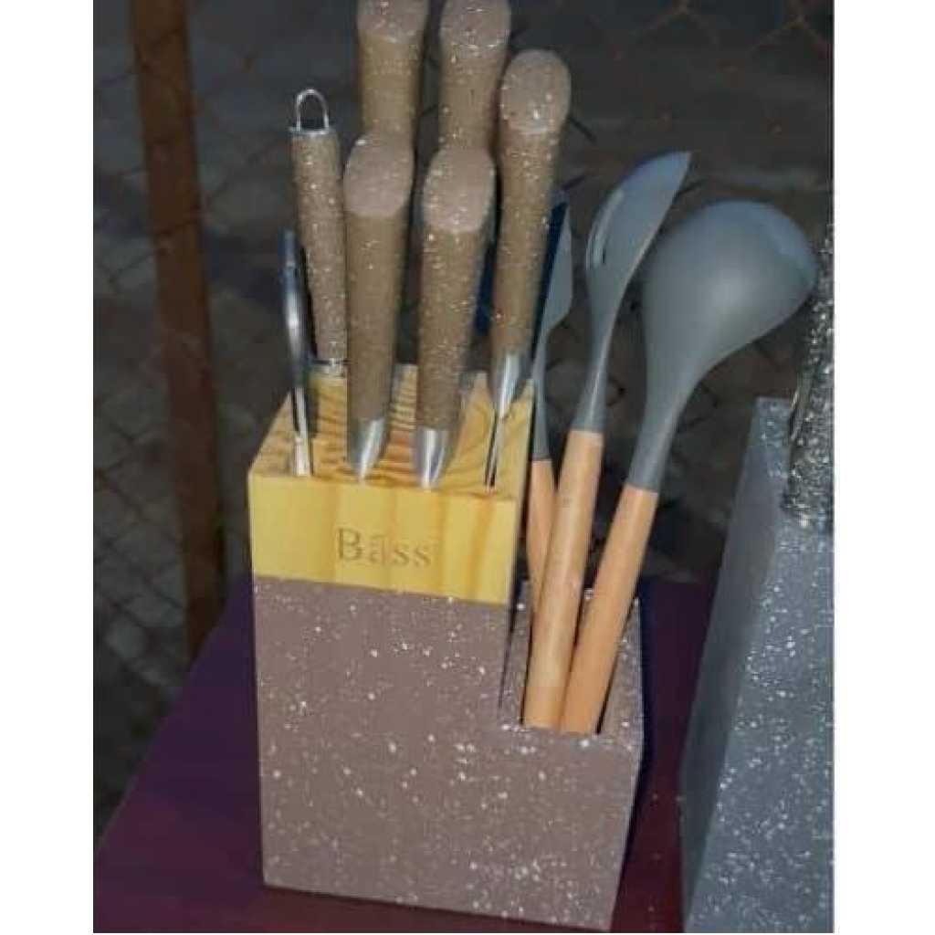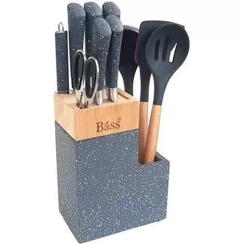 Bass 11 Piece Stainless Steel Modern Knife Set On Bamboo Block Stand And Non-Stick Spoons Utensil Set With cleaver Scissors Bread Knife Steak Knife Sharpener- Multicolor