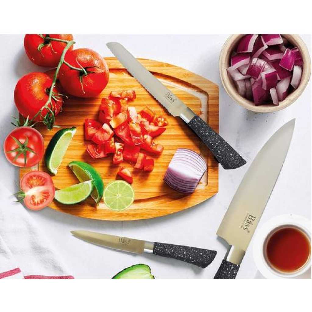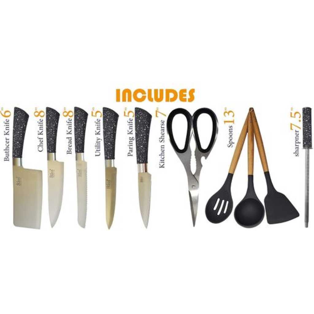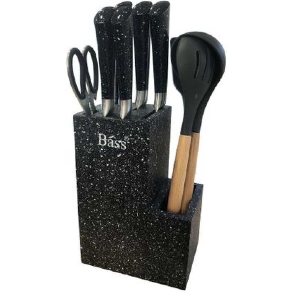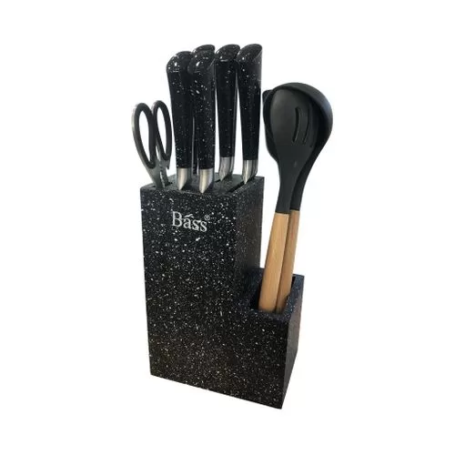 Key Features: Premium Quality: First Quality Stainless Steel and Very Sharp Gift Box: Beautifully Gift Boxed and This will make a great gift! Safety: Dishwasher Safe Design: This unique design of 11 piece set of Bass Stainless Steel knives will provide you with 5 beautiful knives in a Stainless Steel block Complete Set: This beautiful set of knives is sure to compliment your kitchen perfectly