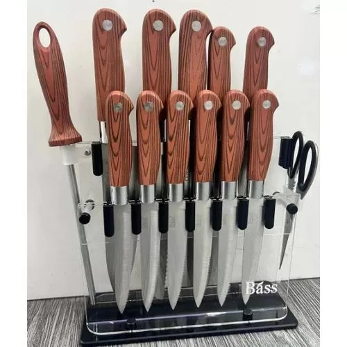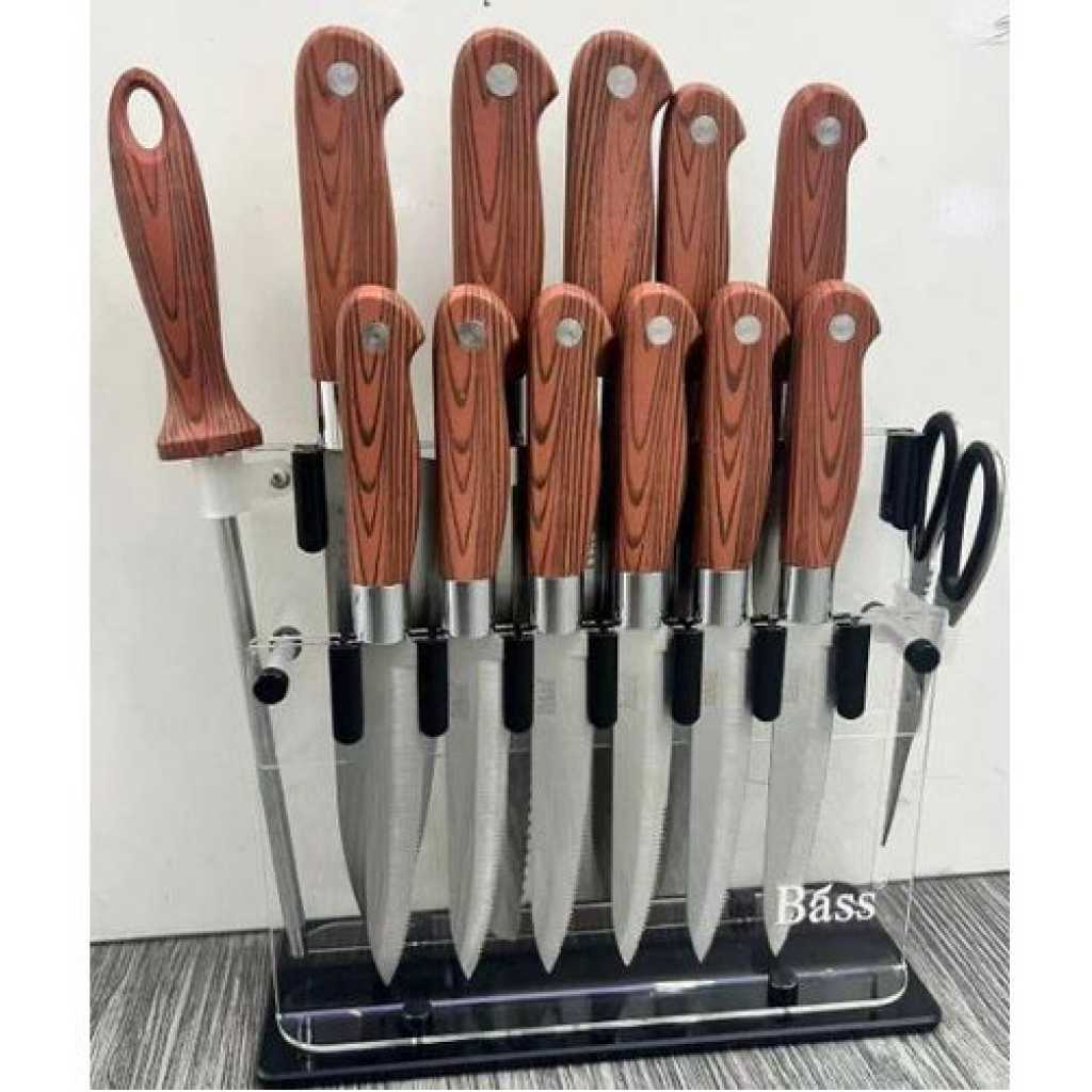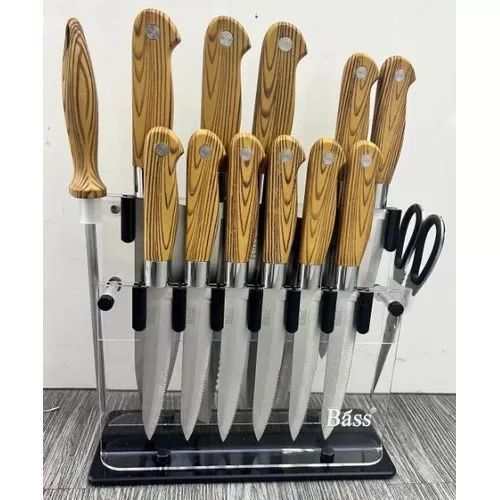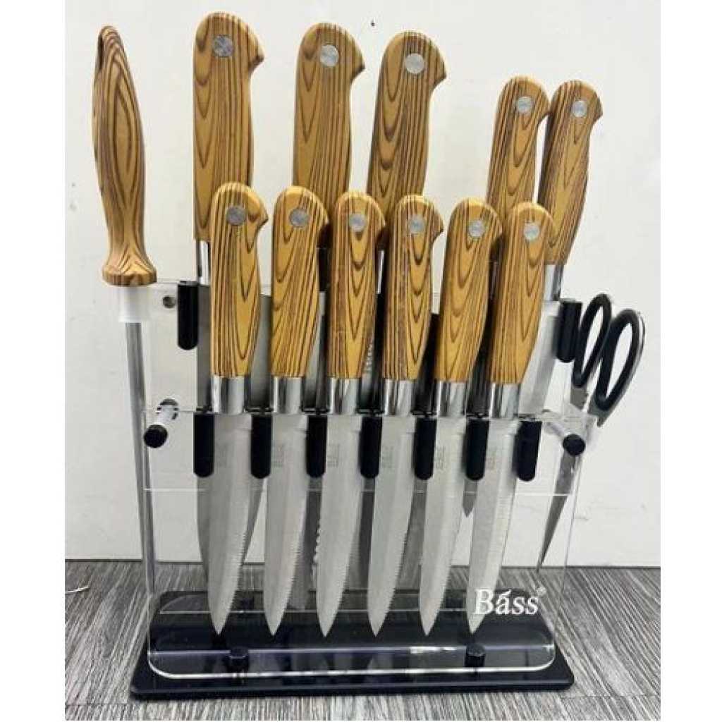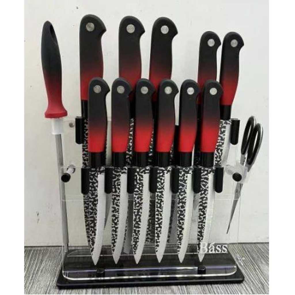 Bass 14 Piece Professional Set of kitchen knives Soft Touch Coated Handle Includes Sharpener, Stand & Vegetable Peeler, Ultra Sharp Cutlery for Cutting and Cooking- Multicolor