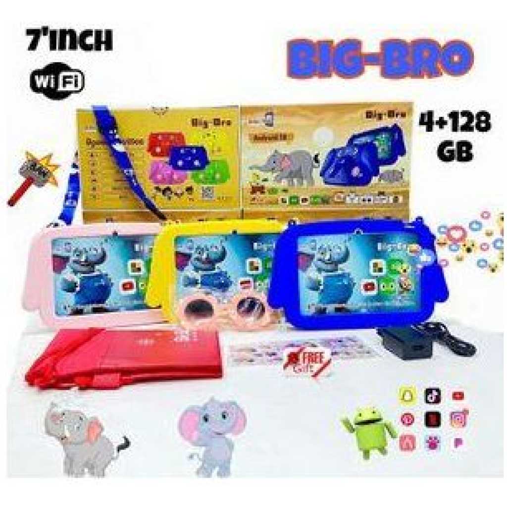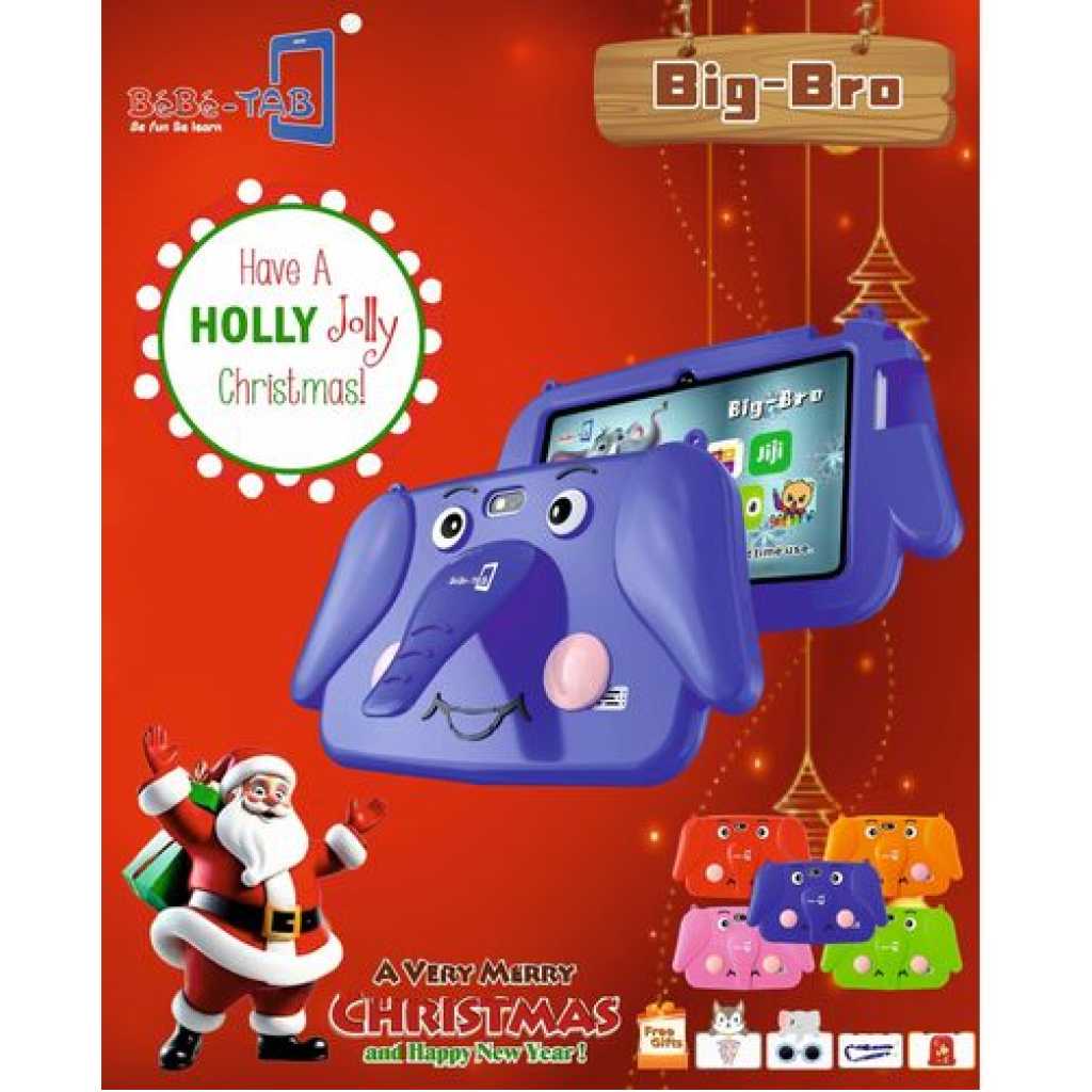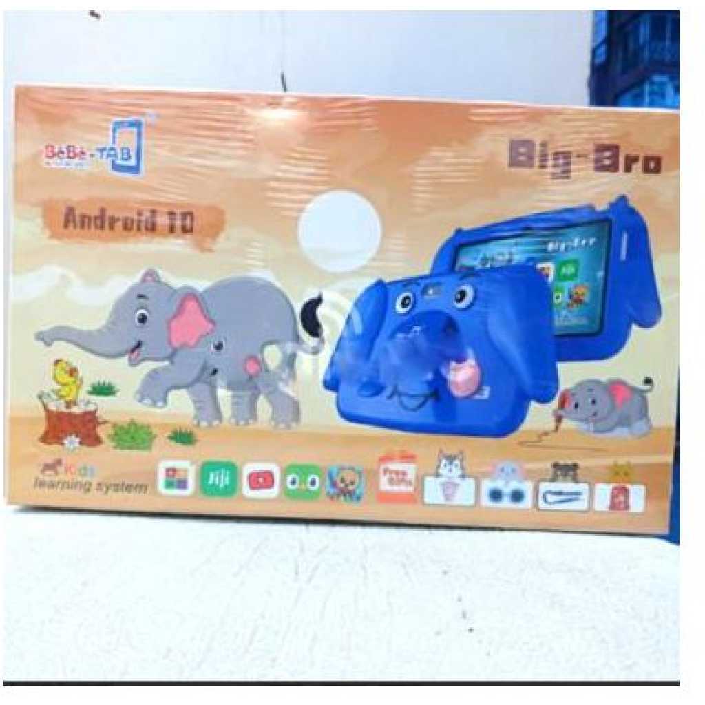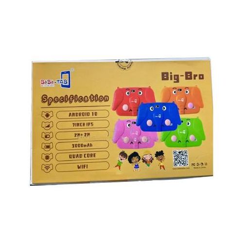 Amazing LCD Display This tablet has a 7 inch Immersive Display ( 1024 x 600 pixels resolution ) with symetric bezel for un-interrupted visual experience for gaming, watching videos, multi-tasking and more BEST GIFT FOR KIDS: Latest IWAWA software, up to 20 pre-installed parent-control free kids apps (including Youtube, Surf-web, Gmail, Voice search, etc), educational games, books, music, and movies, and many more download from installed Google Store; Iwawa allows you to manage usage limits, no need to worry about unfriendly content on the internet, kids can get access to fun and games, books, videos, and browsing internet which you choose for them KID-PROOF CASE: High-quality quality soft and lightweight case to feel comfortable hold in hand and meanwhile protect against any drops and bumps caused by kids at play; The case is environment-friendly, sweat-proof, unscented and will do no harm to kids’ health. LEARNING WHEN PLAYING: We believe an exclusive kid tablet will be the best tool to help your kids discover, learn, and grow, educational learning and practice contents are designed just for your kids to learn while having fun Brand: Bebe-Tab Model: Big bro Type: Tablet OS: Android 10 SIM: WiFi Hardware CPU: Quad-core 1.3GHz Processor RAM: 4GB ROM: 128GB Audio Format: MP3, WAV, AAC, eAAC, M4A Video format : MPEG4, H.264, H.265, MOV Connectivity: WiFi, GSM, Bluetooth, GPRS, Sensors: Accelerometer, Proximity, Light, Gyroscope Network WiFi Display Screen Size: 7″ Display Type: IPS Resolution: 1200*820 Camera Front camera: 2 MP with a flashlight Back camera: 5mp with a flashlight Battery Capacity mAh3000mAh In the box: Tablet, Pouch, Charger and Free Gifts
