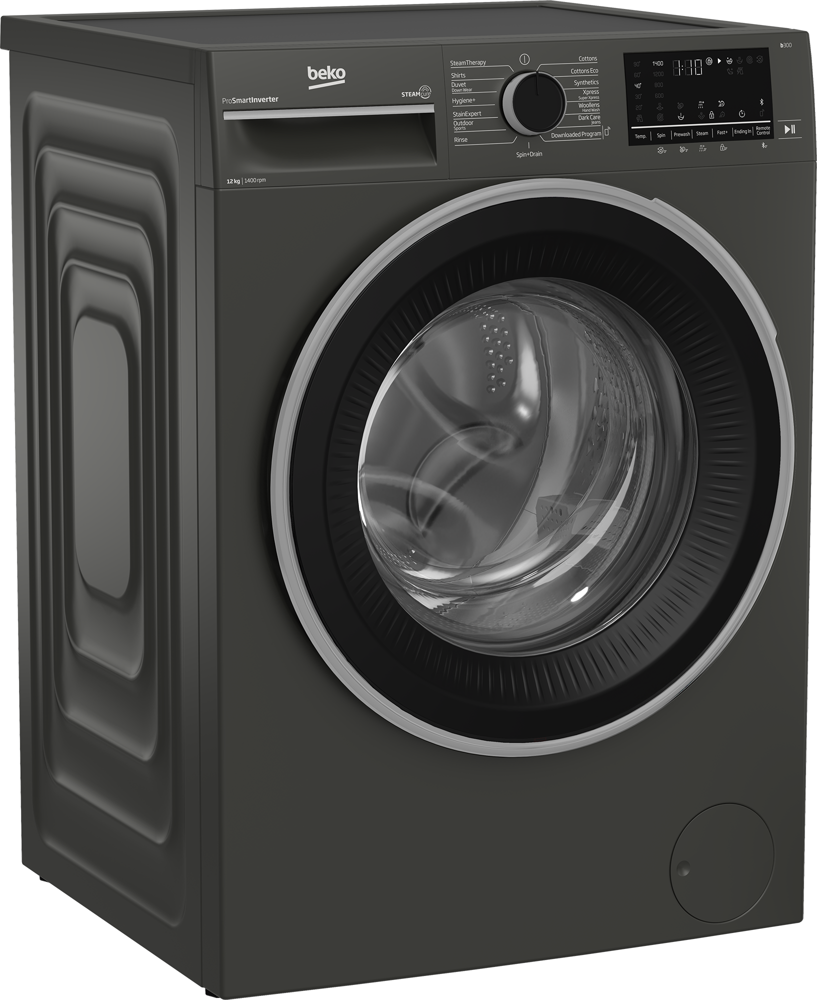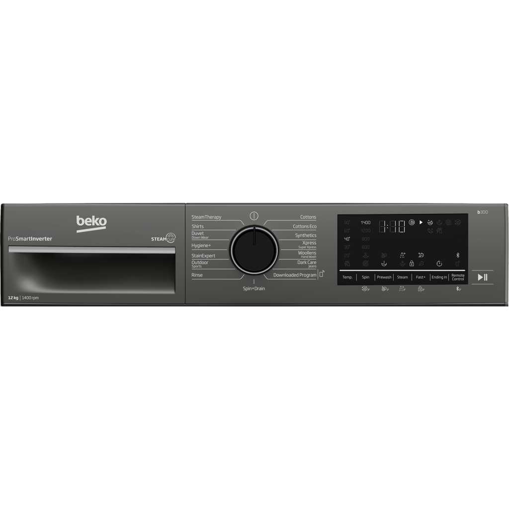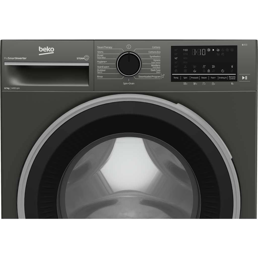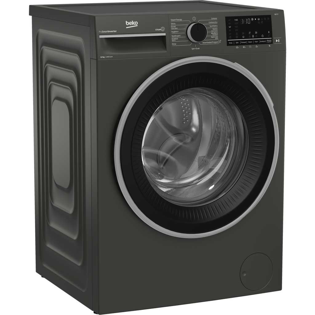 Key Features: Beko 12kg Front Loading Freestanding Washing Machine,1400 rpm, | B3WFT51242MG. UK plug Manhattan grey A+++ (-10%) energy rated 12kg washing capacity 15 programs 1400rpm Beko SteamCure technology Beko ProSmart Inverter Motor (Brushless Silent) Add garment AntiCrease+