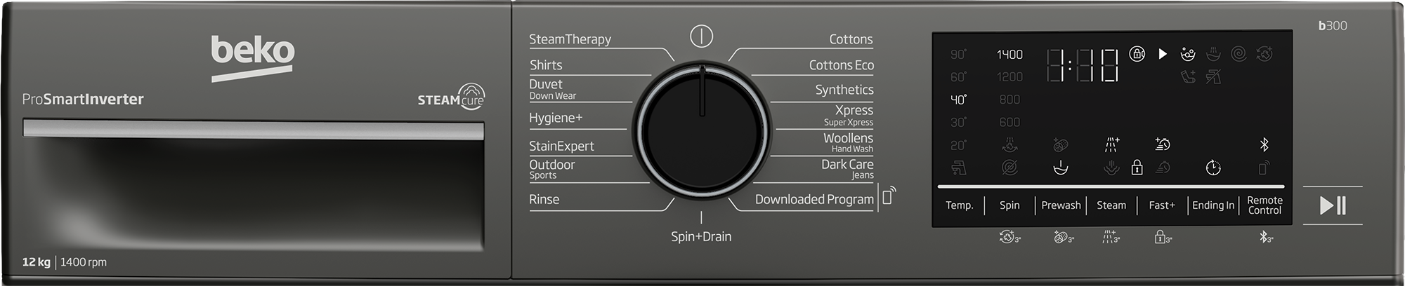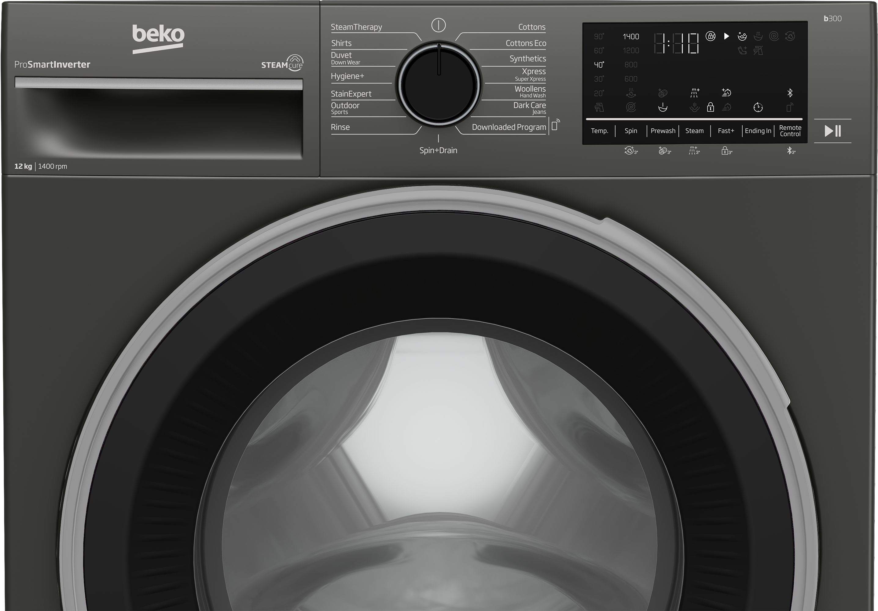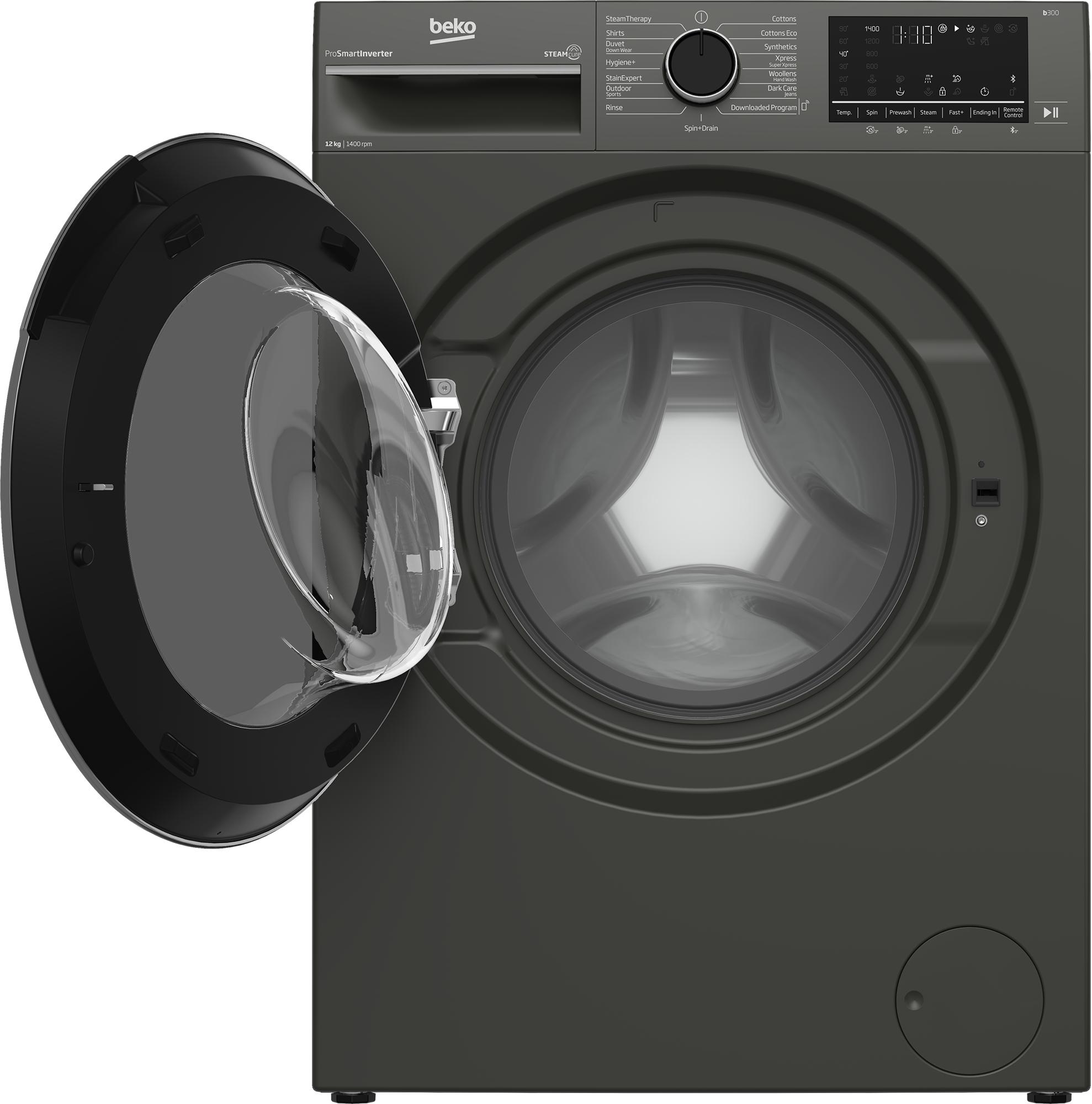 Key Features: Beko 12kg Front Loading Freestanding Washing Machine,1400 rpm, | B3WFT51242MG. UK plug Manhattan grey A+++ (-10%) energy rated 12kg washing capacity 15 programs 1400rpm Beko SteamCure technology Beko ProSmart Inverter Motor (Brushless Silent) Add garment AntiCrease+