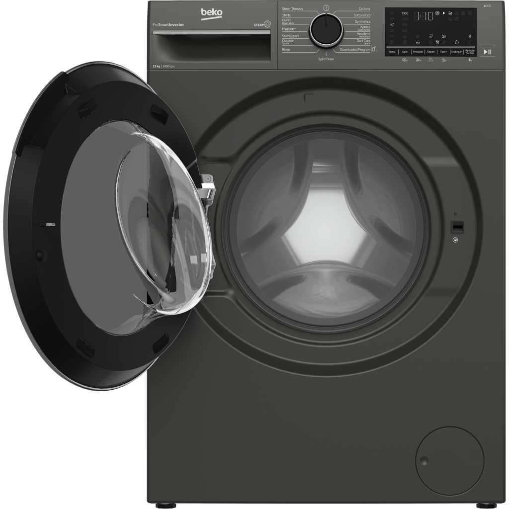 Beko 12kg Front Loading Freestanding Washing Machine,1400 rpm, | B3WFT51242MG. UK plug Manhattan grey A+++ (-10%) energy rated 12kg washing capacity 15 programs 1400rpm Beko SteamCure technology Beko ProSmart Inverter Motor (Brushless Silent) Add garment AntiCrease+ StainExpert Programme Spotless cleaning for 24 types of stains Put the white vinegar, the lemon juice and the dish soap away. They belong in the kitchen and your stained clothes belong in a washing machine with StainExpert Programme. Whether it’s coffee, ketchup, chocolate, makeup or blood, StainExpert is designed specially to get rid of 24 different kinds of stains so you won’t have to pre-treat any stain anymore.