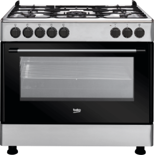 Beko GE 15120 DX: Freestanding Cooker (Fan-assisted, 90cm) With 4 Gas + 1 Wok Gas Burners, 120 – Litres Multifunction Fan Heating Electric Oven With Gas Failure Protection – Stainless Steel Halogen Illumination. Clear view of what’s happening inside Want to see how your cooking is going but don’t want to open the door and lose the heat inside? Halogen Illumination helps you see all your oven’s cavity, so you can keep an eye on your culinary creations with the door firmly shut. Gas Safety. Automatic gas cut-off It’s easy for a flame to go out when you’re not around, unleashing dangerous gas into the house. The Gas Safety feature will detect when a burner flame is extinguished by an over-boiling pot or a gust of wind, and shut off the gas supply. No leaks, no worries. Specifications Hob Type: Gas Burner Configuration: 4 Gas + 1 Wok (triple ring) Burner Plate Design: Metal Ignition Type: Integrated Ignition Gas Safety Device for Hob Burners: Automatic gas cut-off Wide Electric Oven Gas failure safety devices on all 5 burners Electric Grill Cast Iron Pan Supports Glass Lid Integrated Ignition Turnspit / Rotisserie included Oven Lamp B Class Energy Rating