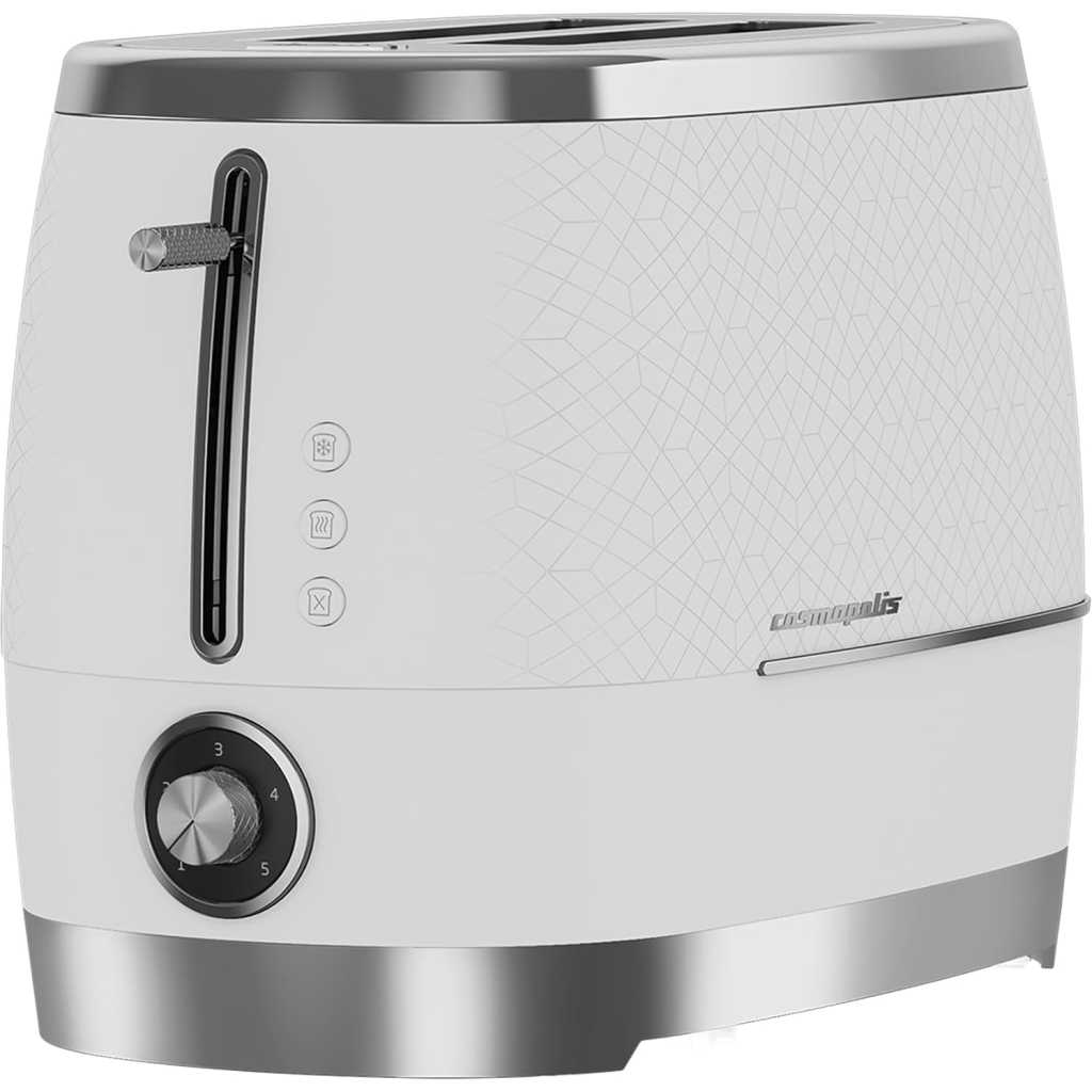 Key Features: Beko Cosmopolis Toaster TAM8202CR. Power: 900W Slice capacity: 2 High Lift function Detachable crumb tray 6 browning Levels Bun-warmer Attachment Defrost function Cancel Reheat White colour