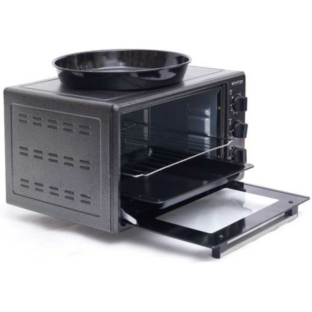 45 Electric Liters Mini Oven – Inox It’s easy to use and very capacious with its 45-liter cavity. It is possible to cook 2 dishes at the same time, and thanks to reduced low power consumption it is a valuable auxiliary kitchen appliance. The convection function offers the possibility to cook food in a shorter time. It is easy to carry and useful in many different situations both indoor and outdoor. The high inner temperature can reach more than 280 degrees, and the special round tray makes this oven very good also for cooking pizza and similar dishes. Power: 1300W Capacity: 45 Lt Convection and Inner light Suitable for a 38cm diameter dish Double glass for thermal insulation Timer: 90 minutes with an auditory signal Adjustable thermostat: from 40°C to 280°C Steel heating elements Cooking functions: double heat, bottom and grill Red light for operation Easy to clean: Enamelled internal walls. Accessories: 1 grid, 1 rectangular tray, 1 Ø37cm round tray Power supply: AC 230V ~ 50/60Hz