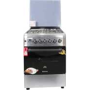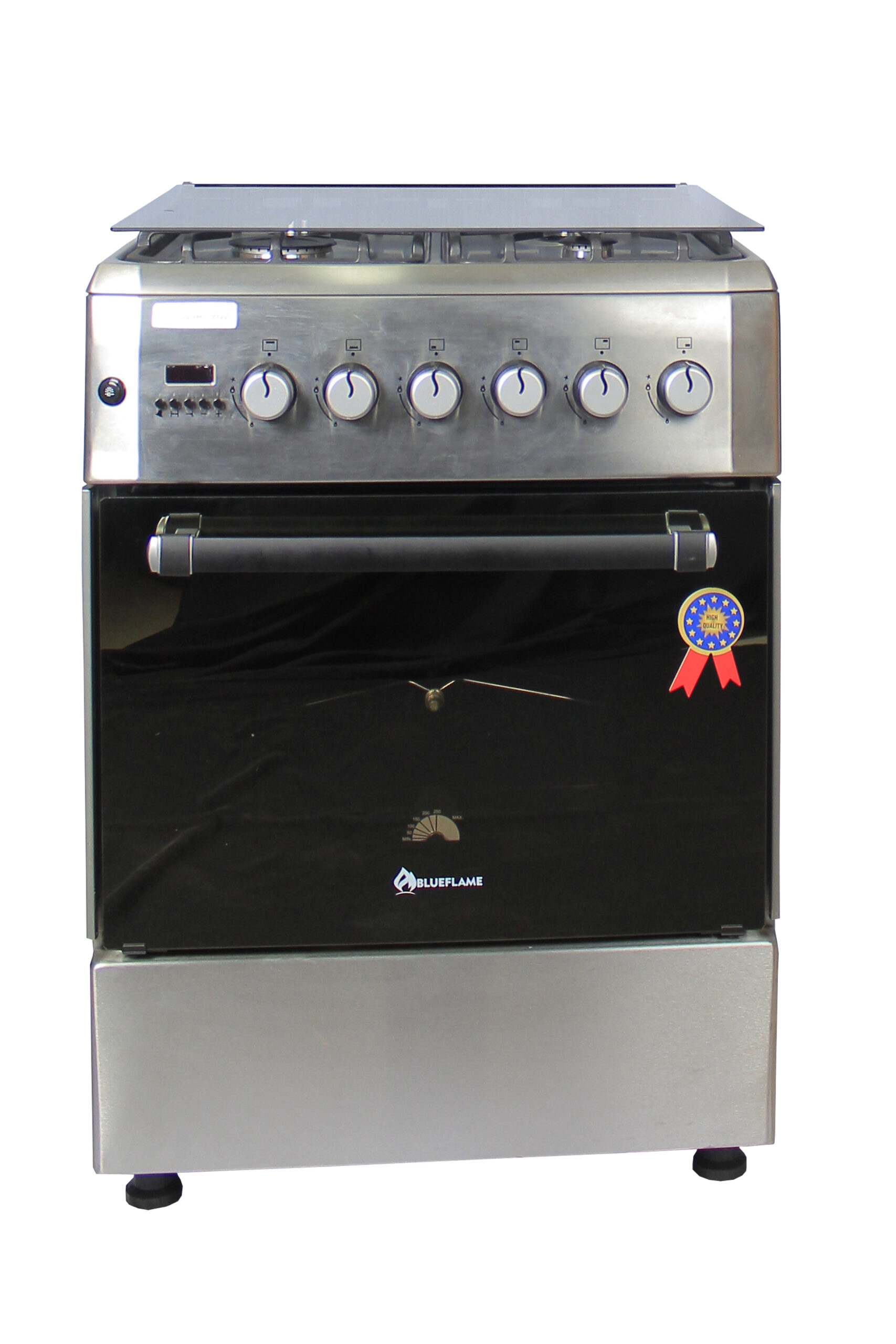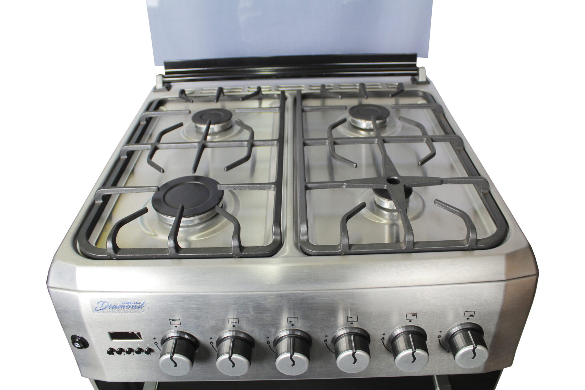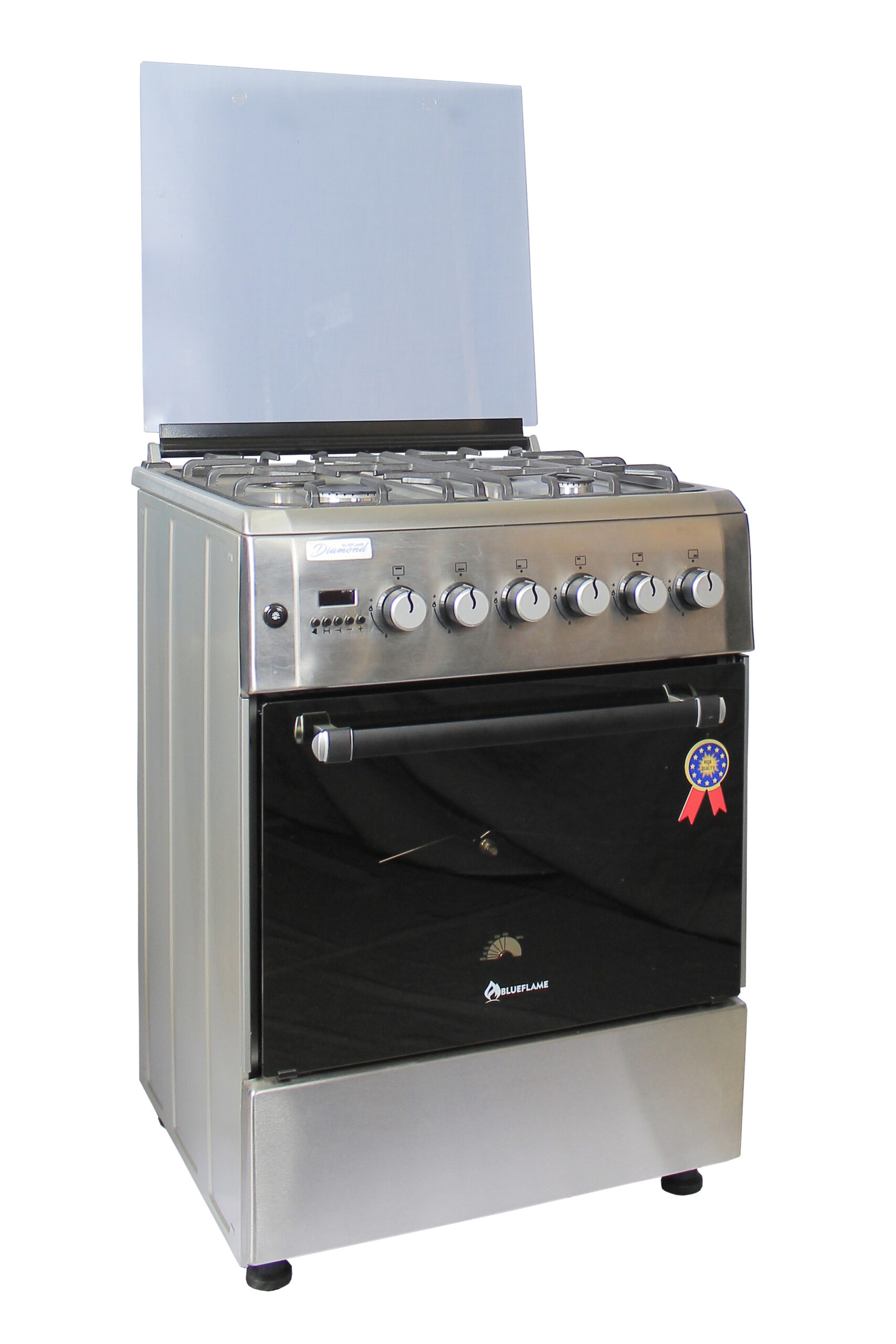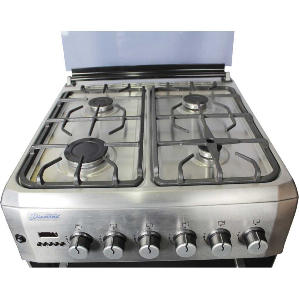 Blueflame 60x60cm Diamond Cooker; Full Gas, 4 Gas Burners, D6040GRF; Gas Oven & Grill, Digital Timer, Thermostat, Oven Lamp, Cast Iron Pan Supports, Rotisserie, Auto Ignition – Inox