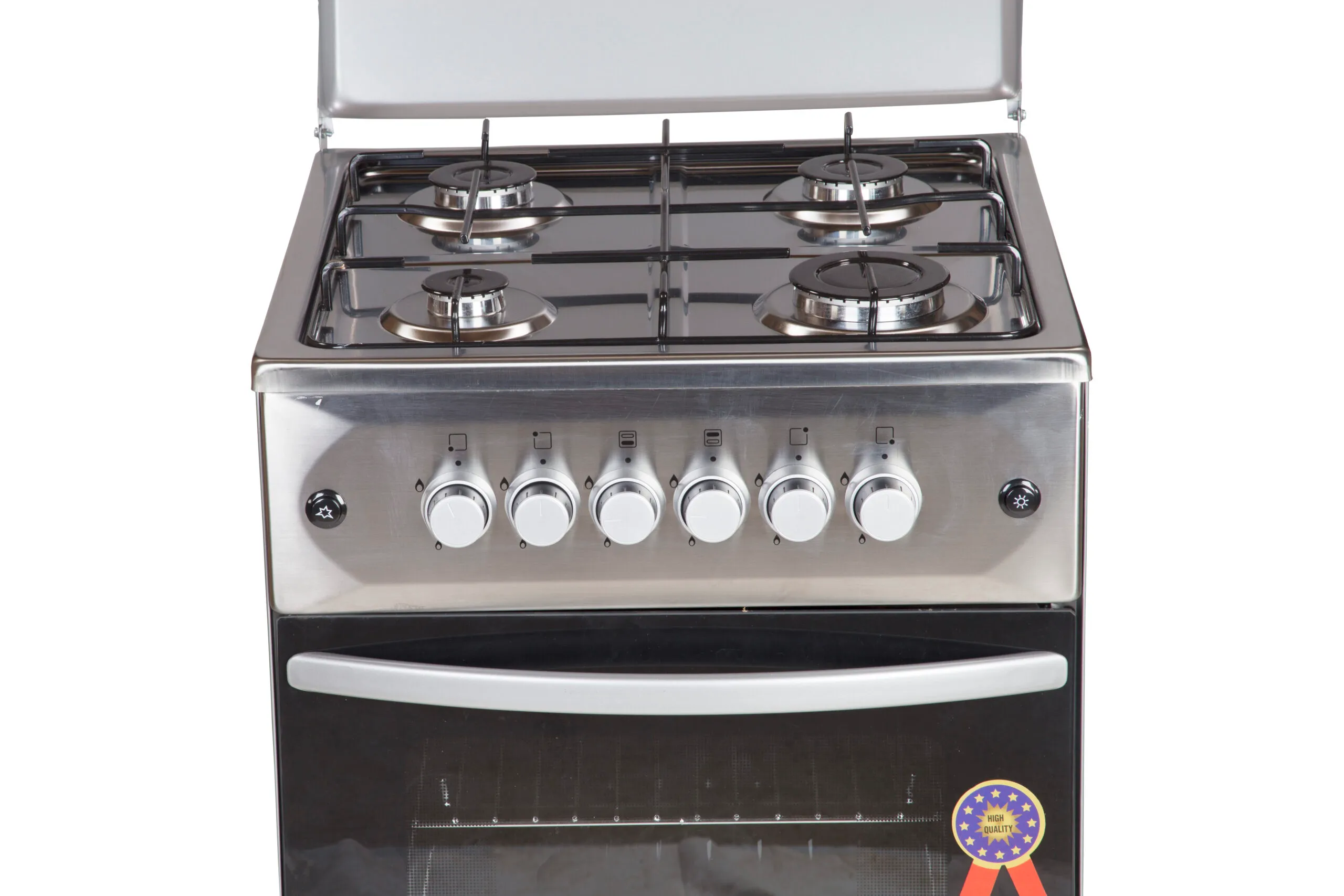 Gas Oven (MANUAL IGNITION) Push Button Ignition Removable Pot Grid Enamel Oven & Hob Cavity Metallic top Lid Oven lamp 1 Tray + Wire Grid Chromed Oven Rack Adjustable Legs Stainless steel 2 year gaurantee and 3 year warranty