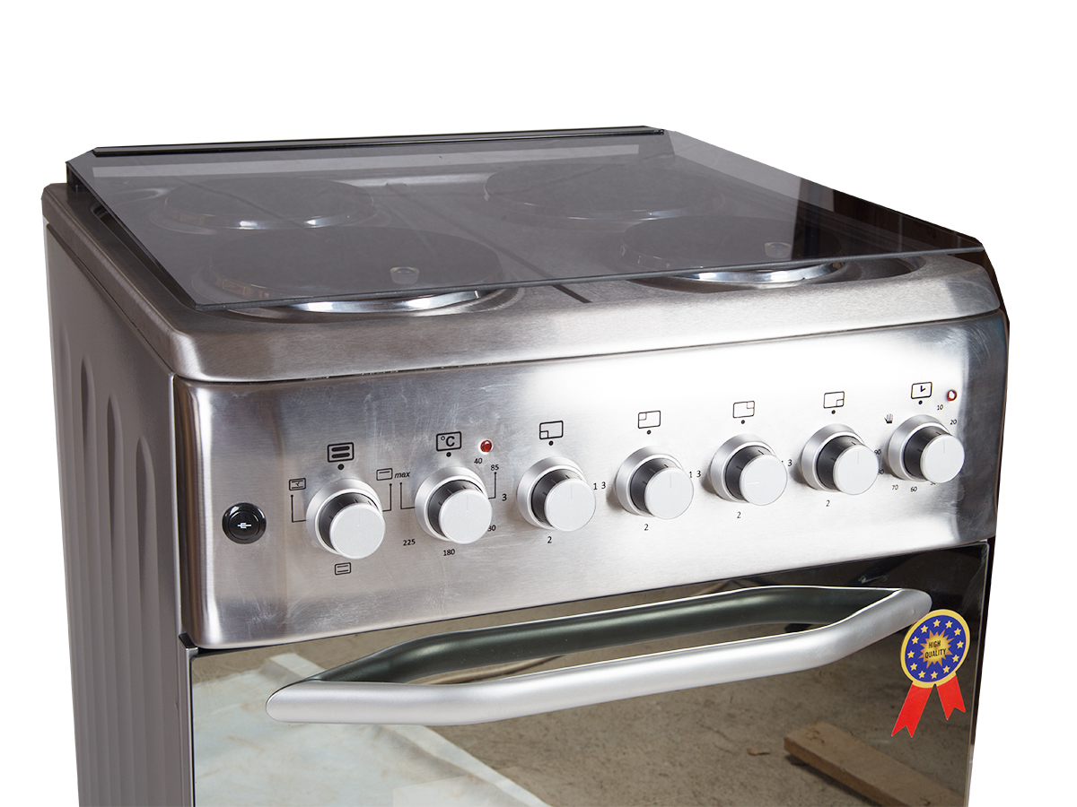 full electric four electric hot plates electric oven with light has a thermostat(temperature regulator) has a turbo fan has a timer has self ignition Rotisserie (Grill) Inox – stainless steel glass top cover 60cm length 60cm width 1 year warranty