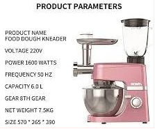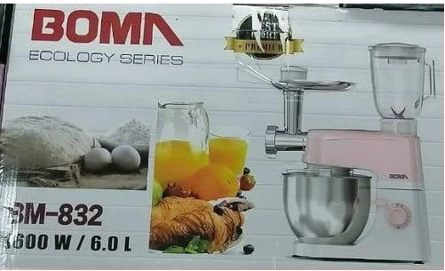 Boma 5-in-1 Multifunctional Stand Mixer Our kitchen stand mixer is equipped with an 7.5QT stainless steel bowl with a dough hook, a beater and a whisk. Also, you can make milkshake and juice with the juice blender, yummy meatballs and meat sauce with the meat grinder. The bowl is updated with two handles for easy operation. The instruction manual includes accessory installation tutorial and recipes, you can use our product without worry. The powerful planetary mixing system for mixing bread dough, thick batters, meringues, and whipping cream, makes the mixing thoroughly and evenly Use the Pulse option, which gets the highest speed, to make juice, milk shake, or rinse the juice cup easily Please do not put the blender into the dishwasher