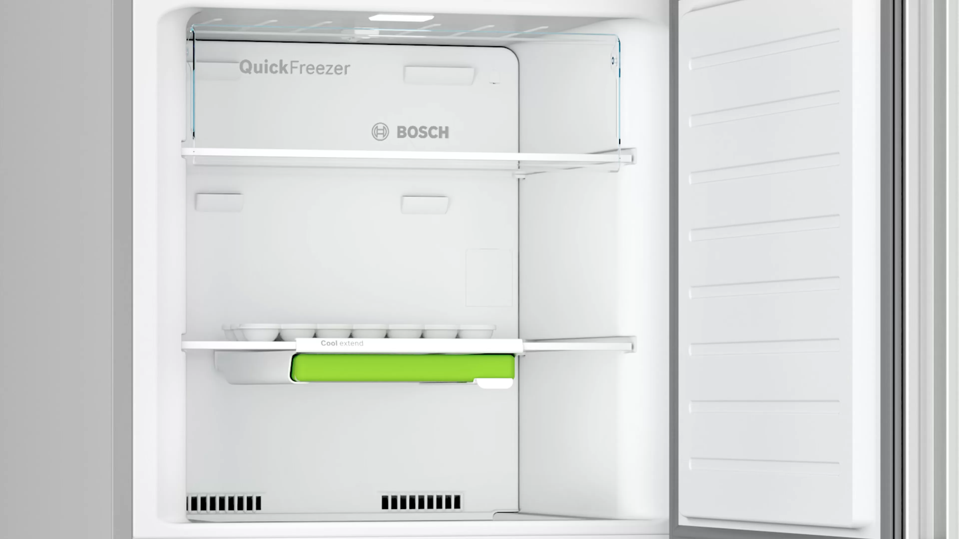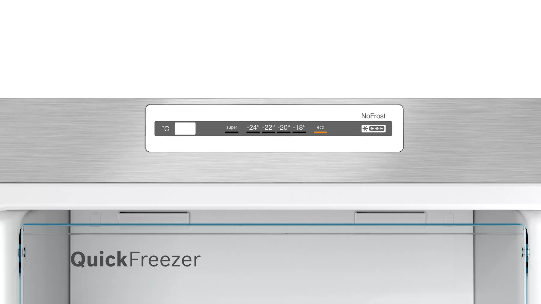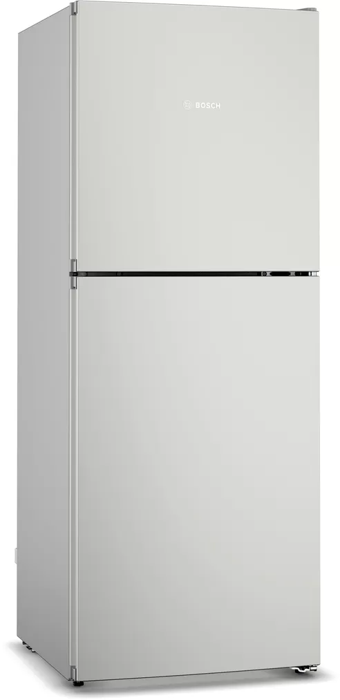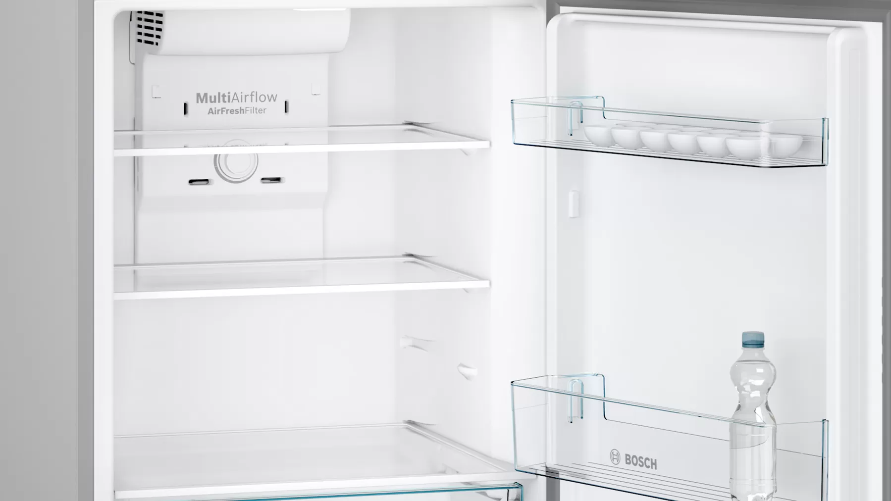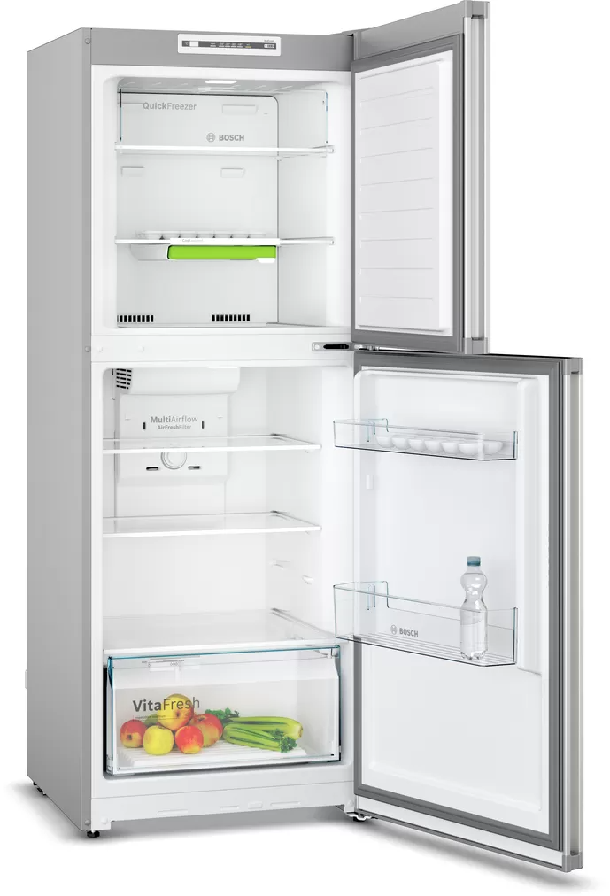 Key Features: Bosch 260 Litre Fridge KDN43VL2N5; Frost Free Freestanding 2-Door Top Freezer Refrigerator – Inox. LED lights bring a completely new lighting concept to fridges, guaranteeing even, glare-free interior illumination. LED lights use less electricity than conventional fridge lights and last an (appliance) lifetime. Two Cooling Circuits: In appliances with separate cooling circuits, the chilling and freezer sections can be controlled separately. Easy-to-use electronic controls allow you to adjust the temperatures individually. Egg Rack FreshSense: Thanks to the optimum storage conditions, your food preserves an ideal consistency; ice cream, for instance, is neither too soft nor too hard. A constant temperature in the fridge interior is a decisive factor in achieving more freshness and flavour. FreshSense sensors constantly monitor and control the ambient, fridge and freezer temperature. A constant temperature inside the fridge, independent of the outer temperature, is the result. MultiAirflow System: The fan-assisted MultiAirflow System causes gentle, even currents of cold air to emerge at all levels of the chilling and freezing area. Temperature fluctuations are minimised and cooling times reduced – which helps your foods retain their flavour for longer.
