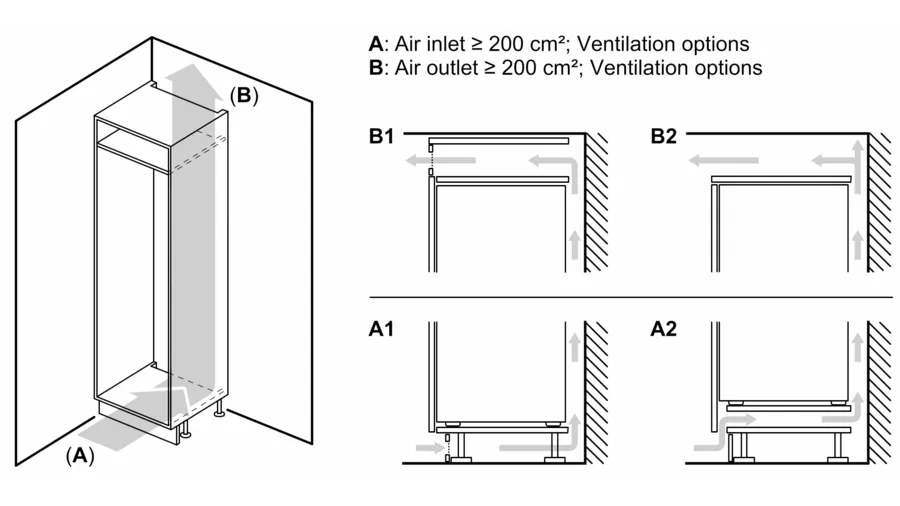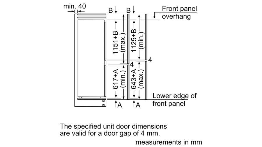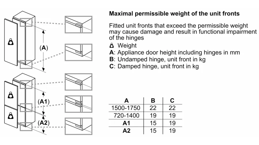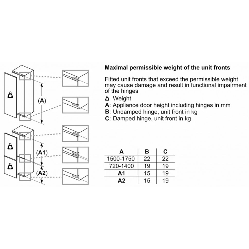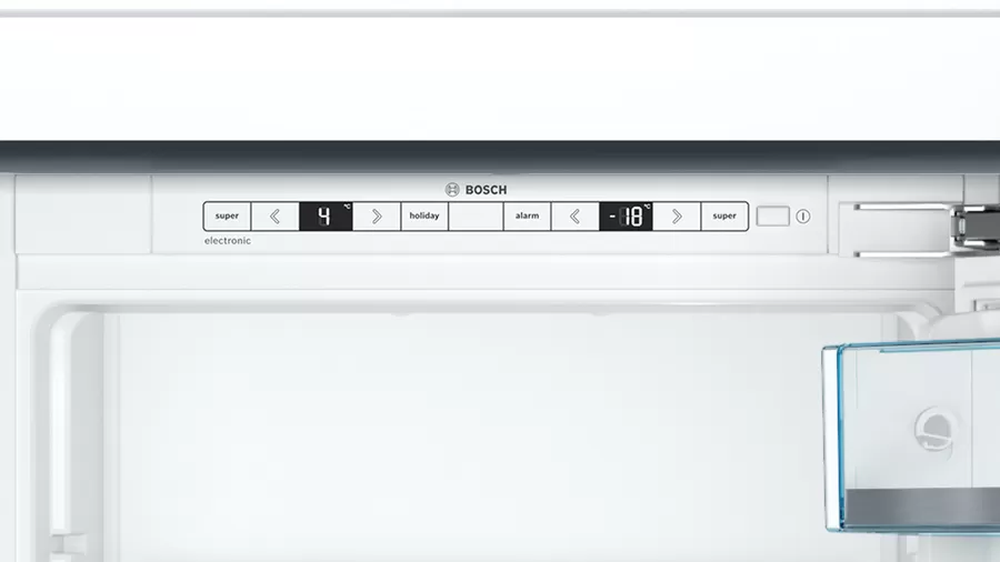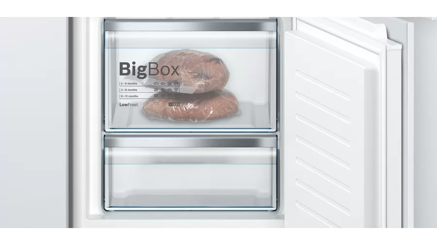 Bosch Serie 6 270 Litre 80/20 Split Integrated Built-in Fridge Freezer KIS87AFE0G The bottom freezer with VitaFresh plus drawer: keeps your fruit and vegetables fresher for longer. Lots of space for XXL frozen goods with the BigBox drawer. An extra-deep frozen food drawer for practical stacking of frozen foods container or large frozen items like gateaux or pizzas. No matter whether you have to cater for a child’s birthday or freeze a wedding cake – in the BigBox you will find enough space for large frozen goods. Effortless storage solutions The divided vario shelf in safety glass can be effortlessly adjusted for putting items into the fridge and removing them. It is ideal for larger items, like upright bottles or bowls, giving you complete flexibility when you need more space. The other half of the shelf is particularly convenient as it smoothly slides under the first. Egg rack The egg rack keeps your eggs safe and prevents them from cracking. Full flexibility in the freezer area You can remove all the safety glass shelves in the freezer area really easily to create more space – to store a multi-level cake, for example, or a whole turkey. Large foods such as a family-sized pizza can be stacked on the glass surfaces without any problem. Insert and remove items at the turn of a hand The shatterproof, frameless glass shelves are particularly easy to use, thanks to the smooth pull-out mechanism. And they also give you a clear view of your food at any time. Alarm The alarm system signals a sound or light when the door is not closed properly SuperFreeze Automatic super freezing: optimal for freezing smaller food loads faster whilst protecting your frozen items from defrosting, thanks to the detection of temperature increase and the automatic decrease of temperature. Defrosting less often saves work and is energy-efficient Constantly having to defrost your conventional freezer not only takes up a lot of your time, but takes up your energy too. LowFrost reduces the amount of ice formation in your freezer to eliminate the need for frequent defrosting. If defrosting should ever be necessary, our freezers with LowFrost feature a practical vent at the base of the appliance for a quick, fuss-free fix. Choose the freezer that looks after you, and itself. Two separate cooling circuits are more convenient and save energy 2 separate cooling circuits, which allow you to control the chilling and freezer compartments independently. Easy-to-use electronic controls allow you to adjust the temperatures individually and prevents odour transfer. The fridge that knows how to keep its cool Activate the SuperCooling function before you go shopping lowers the temperature for a short period, so your fresh shopping is kept at the right temperature. The temperature is lowered by pushing a button (2°C at the lowest). To prevent unnecessary power consumption, the function automatically switches back after approximately 6 hours. FreshSense: perfect storage climate Thanks to the optimum storage conditions, your food preserves an ideal consistency; ice cream, for instance, is neither too soft nor too hard. A constant temperature in the fridge interior is a decisive factor in achieving more freshness and flavour. FreshSense sensors constantly monitor and control the ambient, fridge and freezer temperature. A constant temperature inside the fridge, independent of the outer temperature, is the result. Keeps the contents of your fridge in the spotlight LED lights bring a completely new lighting concept to fridges, guaranteeing even, glare-free interior illumination. LED lights use less electricity than conventional fridge lights and last an (appliance) lifetime. Key Features LED lights bring a completely new lighting concept to fridges VarioZone: more flexibility due to variable-use glass shelves and drawers in the freezer compartment Automatic super freezing: for freezing smaller food loads faster whilst protecting your frozen items from defrosting, thanks to the detection of temperature increase BigBox frozen food drawer: for stacking storage containers or for large frozen food items EasyAccess Shelf: retractable glass shelf for convenient loading and unloading and a perfect view 270 Litres of usable space, 209 litres in the fridge and 61 litres in the freezer 80/20 Split with reversible door hinges and door-on-door assembly 2 year warranty for peace of mind Dimensions (mm): H1772 x W558 x D545 5 Fridge shelves, 1 VitaFresh fruit and veg drawer, 2 freezer drawers Performance and Consumption Energy consumption: 225 kWh kWh/yr. Total net capacity: 270 litres Noise level dB(A) re 1 pW: 36 Climate class SN-T (suitable for ambient temperatures between 10 to 43°C) Functions Bright interior LED fridge light Design features Electronic control for fridge and freezer with LED display FreshSense –