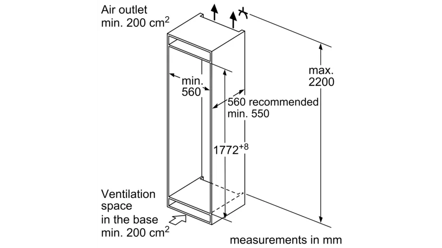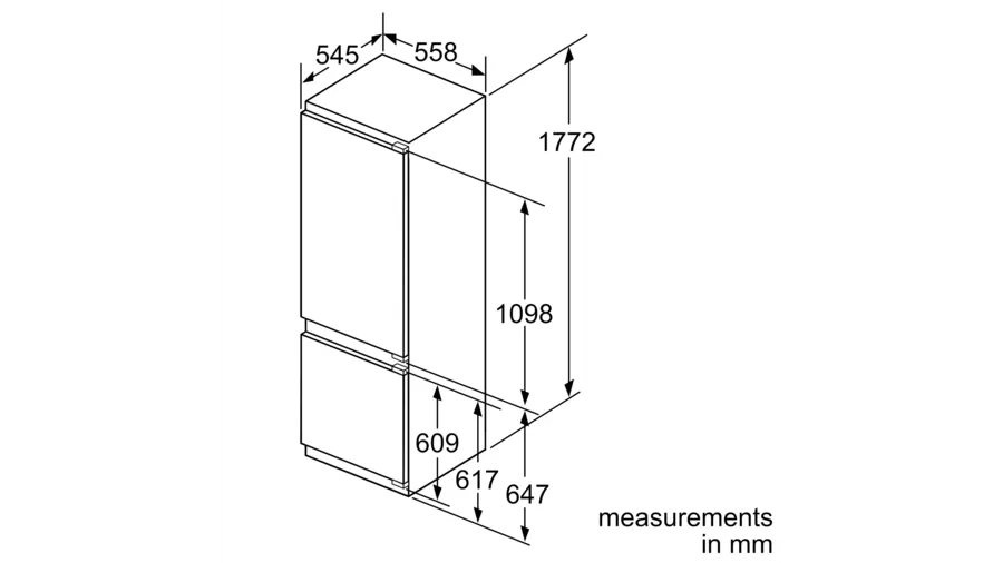 Key Features: Bosch Serie 6 270 Litre 80/20 Split Integrated Built-in Fridge Freezer KIS87AFE0G LED lights bring a completely new lighting concept to fridges VarioZone: more flexibility due to variable-use glass shelves and drawers in the freezer compartment Automatic super freezing: for freezing smaller food loads faster whilst protecting your frozen items from defrosting, thanks to the detection of temperature increase BigBox frozen food drawer: for stacking storage containers or for large frozen food items EasyAccess Shelf: retractable glass shelf for convenient loading and unloading and a perfect view 270 Litres of usable space, 209 litres in the fridge and 61 litres in the freezer 80/20 Split with reversible door hinges and door-on-door assembly 2 year warranty for peace of mind Dimensions (mm): H1772 x W558 x D545 5 Fridge shelves, 1 VitaFresh fruit and veg drawer, 2 freezer drawers