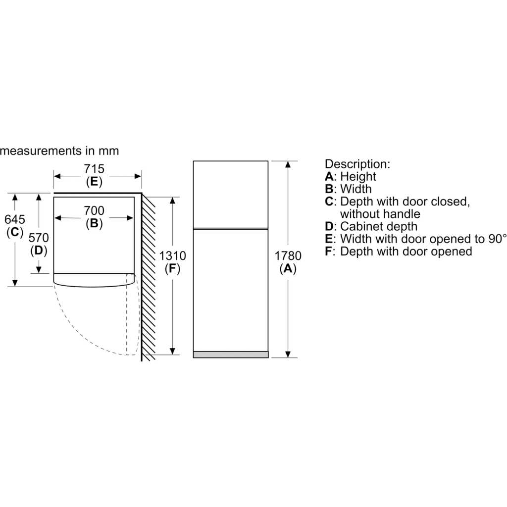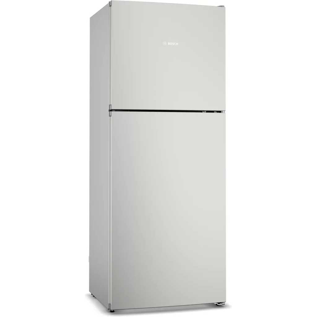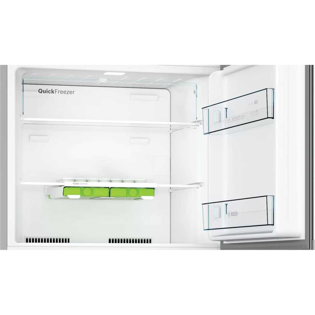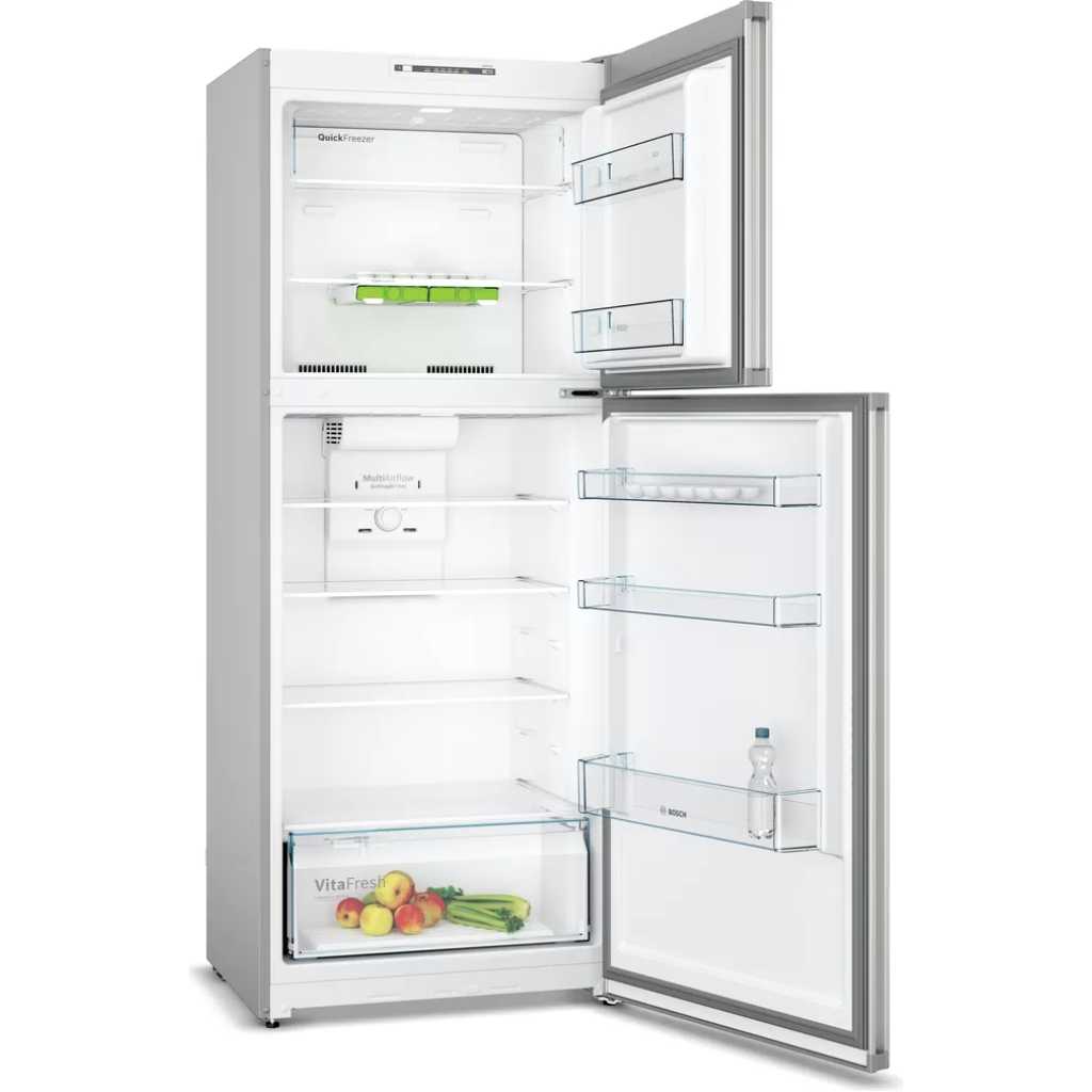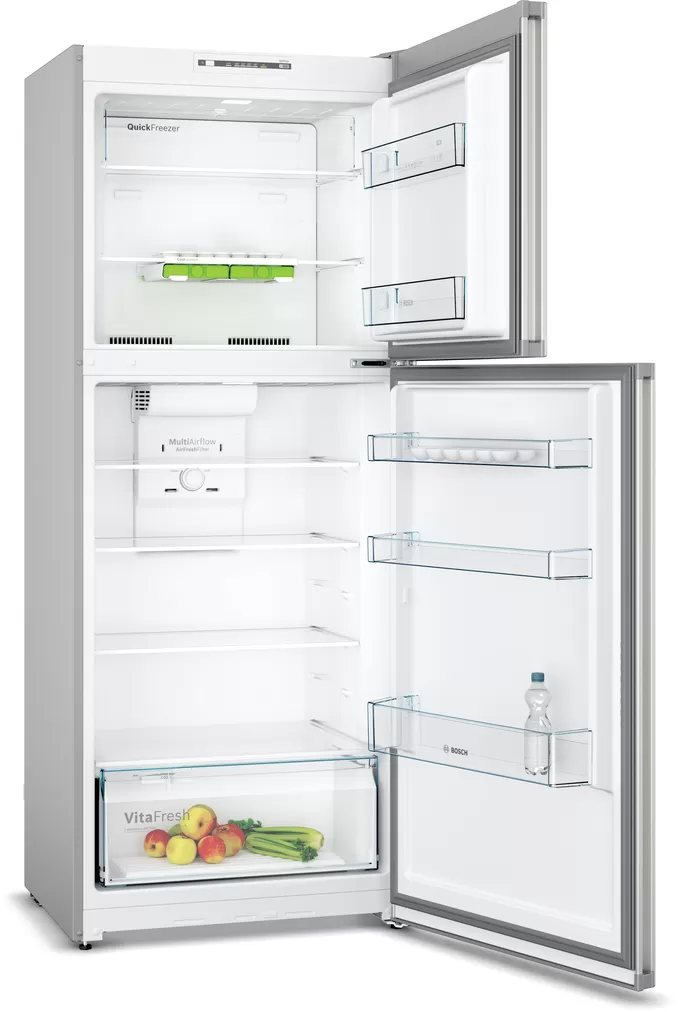 Bosch 430 Litre Freestanding No Frost 2-Door Top Freezer Refrigerator, KDN43N12N5. 380L Net Capacity No frost Refrigerator XL FREEZER – 30% MORE SPACE Inverter compressor (10 years compressor warranty) 4-star freezing (Freezer capability to go to -24 degrees) Cool extend – up to 30 hours cooling retention in the freezer (in case of a power cut when the door is not opened) Quick freezing zone 2 cool packs provided with specific pocket attachments Super freeze function LED light in fridge and freezer compartment Digital temperature control for the freezer Vita fresh drawer for fruits and vegetables (with humidity control) 3 Glass shelves in the fridge compartment Egg and ice trays provided Silver finish