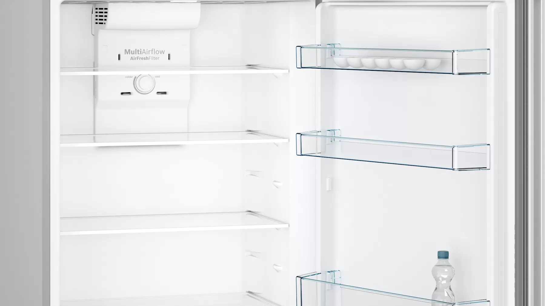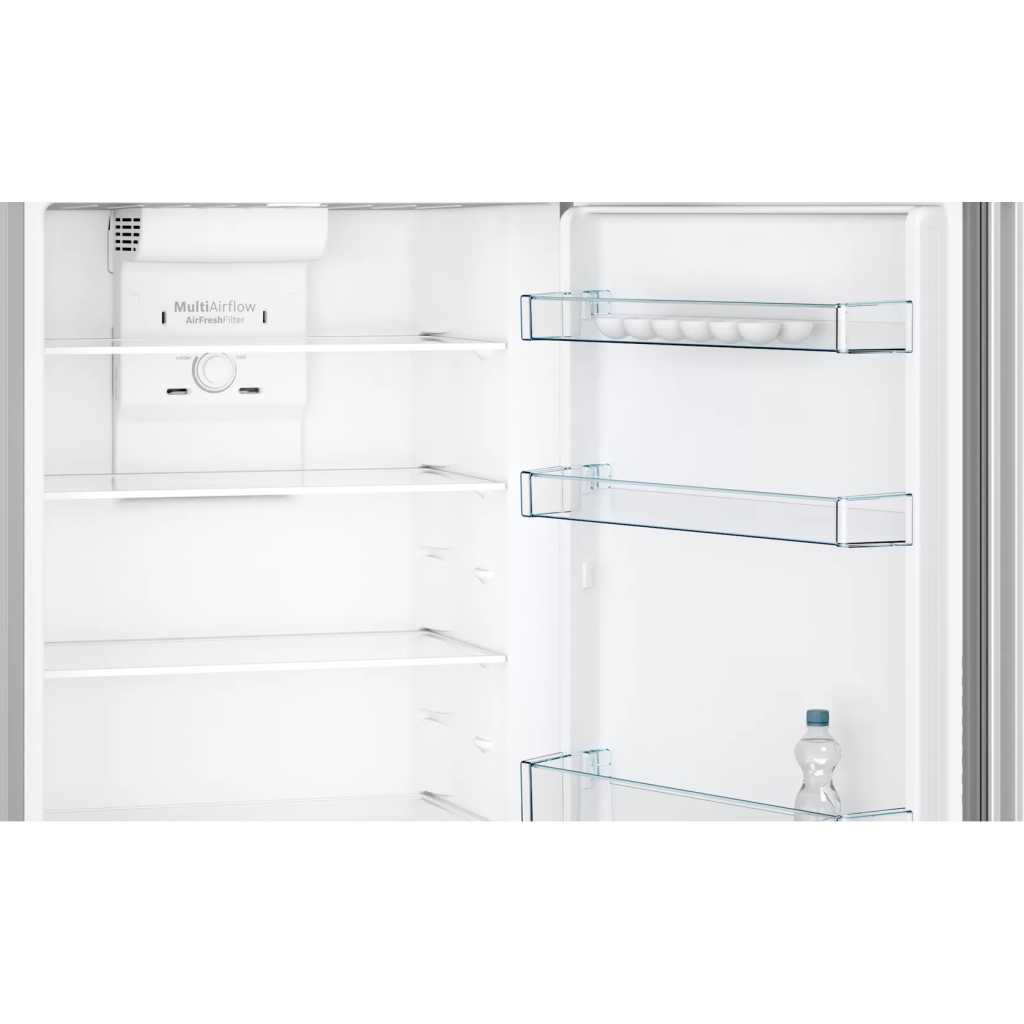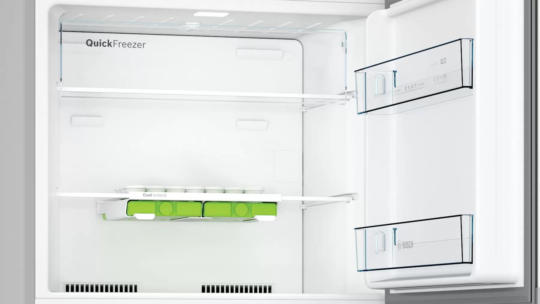 Key Features: Bosch 430 Litre Freestanding No Frost 2-Door Top Freezer Refrigerator, KDN43N12N5. 380L Net Capacity No frost Refrigerator XL FREEZER – 30% MORE SPACE Inverter compressor (10 years compressor warranty) 4-star freezing (Freezer capability to go to -24 degrees) Cool extend – up to 30 hours cooling retention in the freezer (in case of a power cut when the door is not opened) Quick freezing zone 2 cool packs provided with specific pocket attachments Super freeze function LED light in fridge and freezer compartment Digital temperature control for the freezer Vita fresh drawer for fruits and vegetables (with humidity control) 3 Glass shelves in the fridge compartment Egg and ice trays provided Silver finish