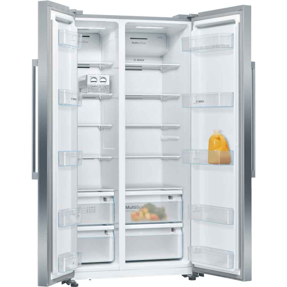 Bosch 616 Litres Fridge, KAN93VIFPG Series 4 – American Side By Side – 178.7 x 90.8 cm – Brushed Steel Anti-Fingerprint. MultiBoxes with rippled base: protects fruits and vegetables from condensation NoFrost: never defrost again, thanks to perfect protection from ice formation – that saves time and effort IceTwister: easy to remove and fill – for lots of ice cubes TouchControl operation: convenient temperature control via easy-to-read sensor fields 560 Litres of usable space, 371 litres in the fridge and 181 litres in the freezer 1 year warranty for peace of mind Dimensions (mm): H1787 x W908 x D707 5 Fridge shelves, 2 fruit and veg drawers, 5 freezer shelves, 3 freezer drawers, 1 twist ice maker The NoFrost side-by-side fridge-freezer with indoor electronics: provides a modern door display Egg rack The egg rack keeps your eggs fresh and prevents them from cracking. Full flexibility in the freezer area You can remove all the safety glass shelves in the freezer area really easily to create more space – to store a multi-level cake, for example, or a whole turkey. Large foods such as a family-sized pizza can be stacked on the glass surfaces without any problem. Alarm The alarm system signals a sound or light when the door is not closed properly or when other errors occur. Save energy whilst you are away When the Holiday Mode function is activated, the temperature in the fridge section is approx. +14°C and in the freezer approx. −18°C, protecting frozen foods and preventing energy wastage in the fridge. Protects frozen food from defrosting Adding new food to the freezer raises the internal temperature, which can result in defrosting and a loss of flavour. The SuperFreezing function ensures that new food is frozen quickly and thereby prevents the other content inside the freezer from defrosting. Appliances with an automatic freezing function return to normal operation once the required temperature is reached, in order not to waste energy. As a result, frozen food keeps its flavour, even when new food is being added. The fridge that knows how to keep its cool Activate the SuperCooling function before you go shopping lowers the temperature for a short period, so your fresh shopping is kept at the right temperature. The temperature is lowered by pushing a button (2°C at the lowest). To prevent unnecessary power consumption, the function automatically switches back after approximately 6 hours. Multi Airflow System: even air distribution for longer freshness The fan-assisted MultiAirflow System causes gentle, even currents of cold air to emerge at all levels of the chilling and freezing area. Temperature fluctuations are minimised and cooling times reduced – which helps your foods retain their flavour for longer. FreshSense: perfect storage climate Thanks to the optimum storage conditions, your food preserves an ideal consistency; ice cream, for instance, is neither too soft nor too hard. A constant temperature in the fridge interior is a decisive factor in achieving more freshness and flavour. FreshSense sensors constantly monitor and control the ambient, fridge and freezer temperature. A constant temperature inside the fridge, independent of the outer temperature, is the result. Never defrost your fridge again Defrosting a fridge by hand can be very annoying and time-consuming. Thanks to our new fridges with NoFrost, you can easily remove this task from your to-do list for good. Unlike in conventional fridges, the air humidity in a NoFrost fridge is permanently collected in a central chiller unit, which automatically defrosts on a frequent basis. The resulting condensation is simply channelled outside out of the fridge, where it then evaporates. This way, NoFrost permanently keeps your fridge free of not only ice, but also the need for manual defrosting. For totally cool drinks: The Ice-Twister Now you can compete with any beach bar. With fresh ice cubes from the practical and removable ice twister, your cold drinks will taste even better. With 20 ice cubes per fill, its quick and easy to get refreshingly cool beverages at the drop of a hat. Keeps the contents of your fridge in the spotlight LED lights bring a completely new lighting concept to fridges, guaranteeing even, glare-free interior illumination. LED lights use less electricity than conventional fridge lights and last an (appliance) lifetime. Enough space for all your fresh food The multi box drawer is suitable for storing fruits and vegetables – especially large items such as big lettuce have enough space.