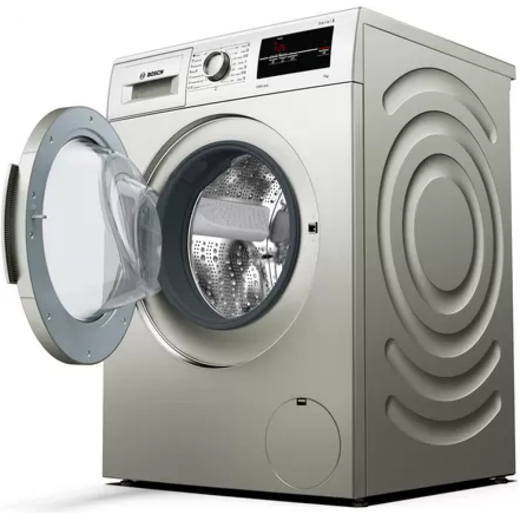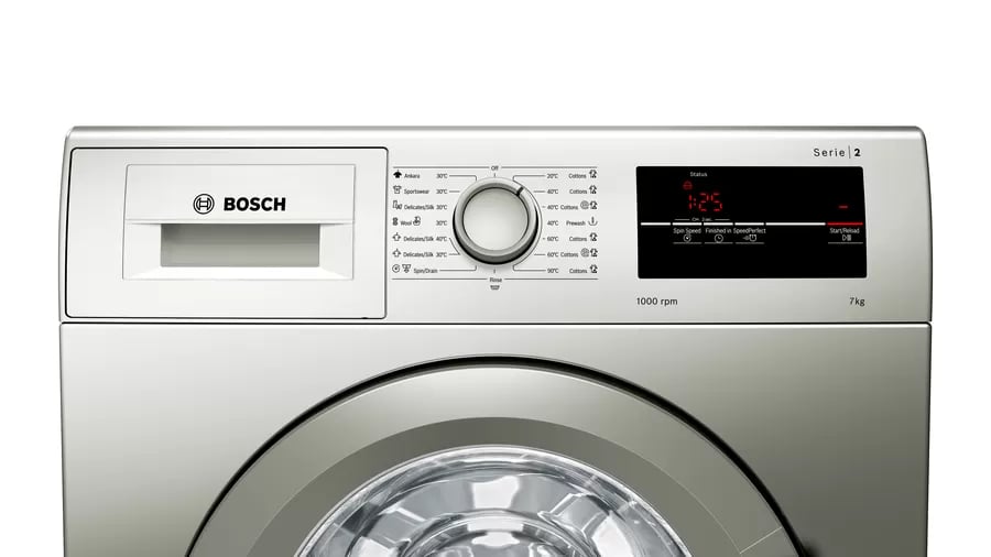 Bosch 8KG WAJ2018SKE Front Load Washing Machine 8KG – Silver Guaranteed to be long-lasting and extraordinarily quiet. The level of noise in your house can often make or break your day. Especially when you want to have dinner in peace and quiet with your family. Bosch’s EcoSilence Drive is so quiet, that sometimes you may forget that your washing machine is on. Equipped with a brushless, energy-efficient motor that optimally reduces friction noise and is quiet in operation with an especially long life and with a 10-year warranty. Outstanding washing results thanks to optimum water distribution This drum thinks for itself: The droplet-shaped structure and the size of the paddles ensure faster and more even water distribution – producing outstanding washing results. The whisper quiet washing machine. The innovative AntiVibration design of the side walls is not only eye catching: the system also provides more stability and reduces vibration. The enhanced insulation also regulates noise levels, making Bosch washing machines very quiet, even during the spin cycle. Never miss an item again, with Reload. Forgot a kid’s sock, your t-shirt,..? Nevermind. When was the last time, you just loaded the washing machine, started the wash cycle and then realised that you forgot a kid’s sock or a t-shirt? The reload function in our washing machines lets you simply add missed out clothes or remove clothes even during a wash cycle*. Just pause the running cycle and open the door, to simply reload your forgotten items into the drum and continue the wash. (*Reloading is not possible when water temperature is higher than 50°C or when water level is too high.)