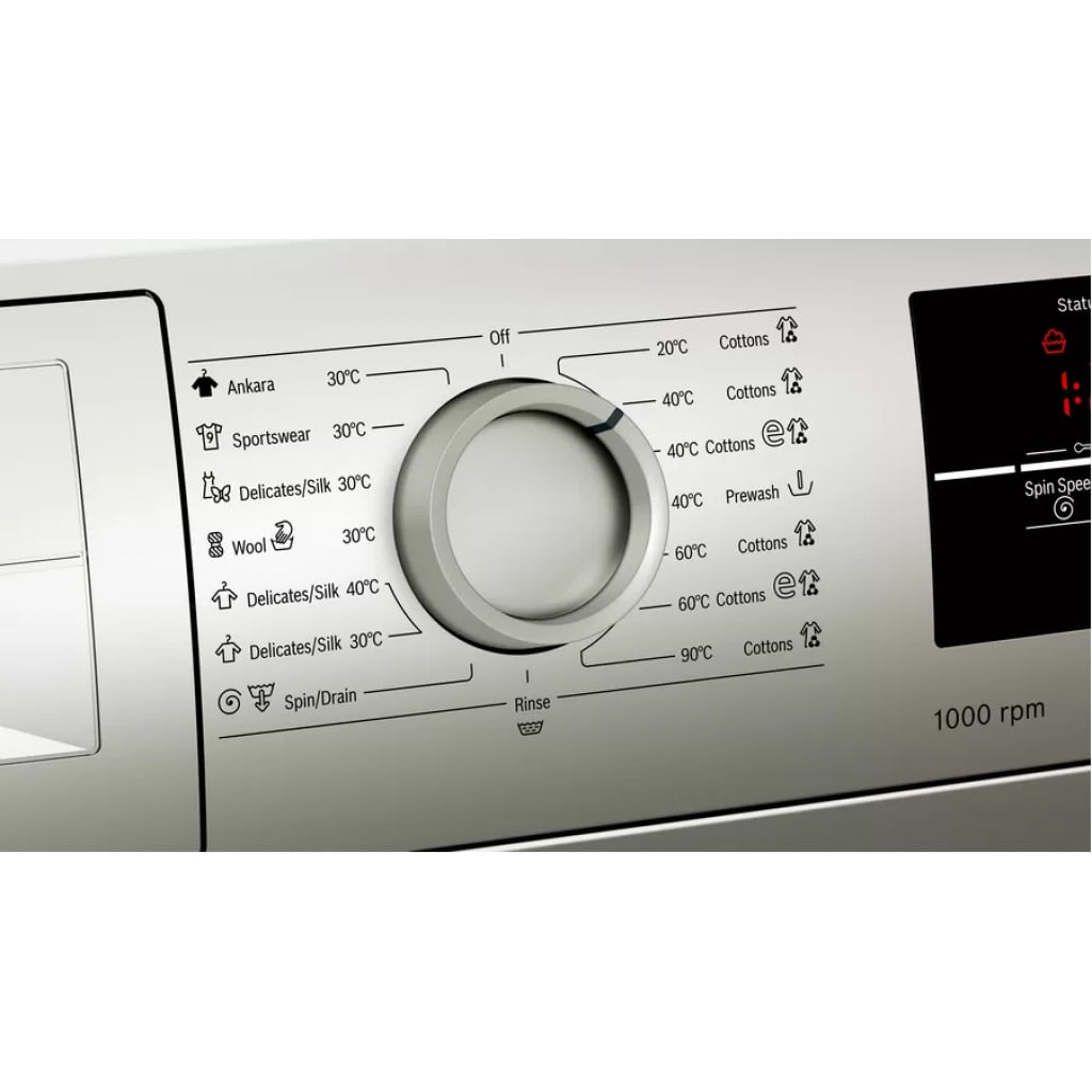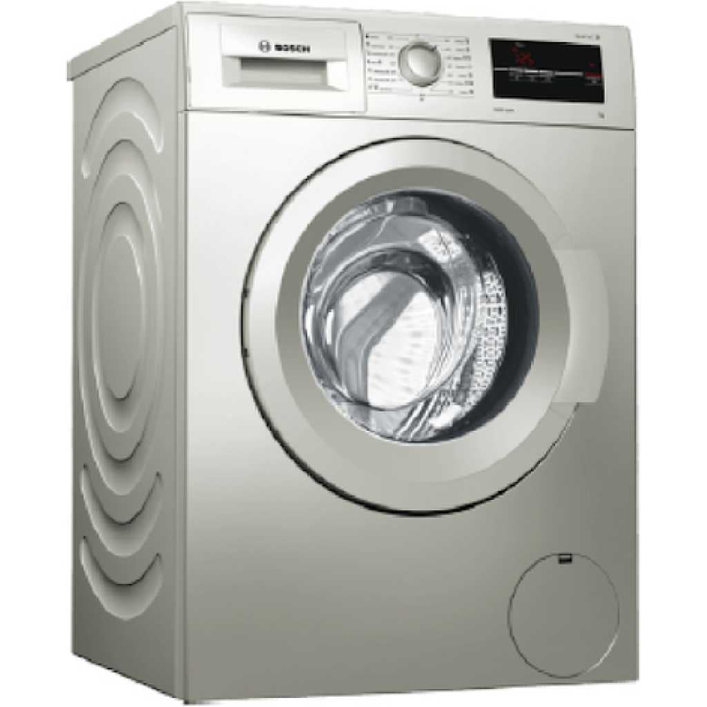 Key Features: Bosch 8KG WAJ2018SKE Front Load Washing Machine 8KG – Silver 8Kg Front loader 1000 Rpm A+++ Energy efficiency rating Eco silence drive motor Anti-vibration side panel design 15 programs (Ankara, Sportswear 30, Delicates/Silk 30, Wool 30, Easy care 40, Easy care 30, Spin/Drain, Rinse, 20 Cotton, 40 cotton, Cotton Eco 40, Pre-wash 40, Cotton 60, Cotton Eco 60, Cotton 90) Active water plus Wave drum design Speed perfect function Large LED display panel Detergent, softener and bleach dispenser Emergency manual drain Silver finish