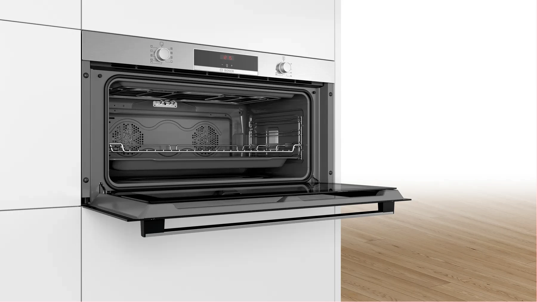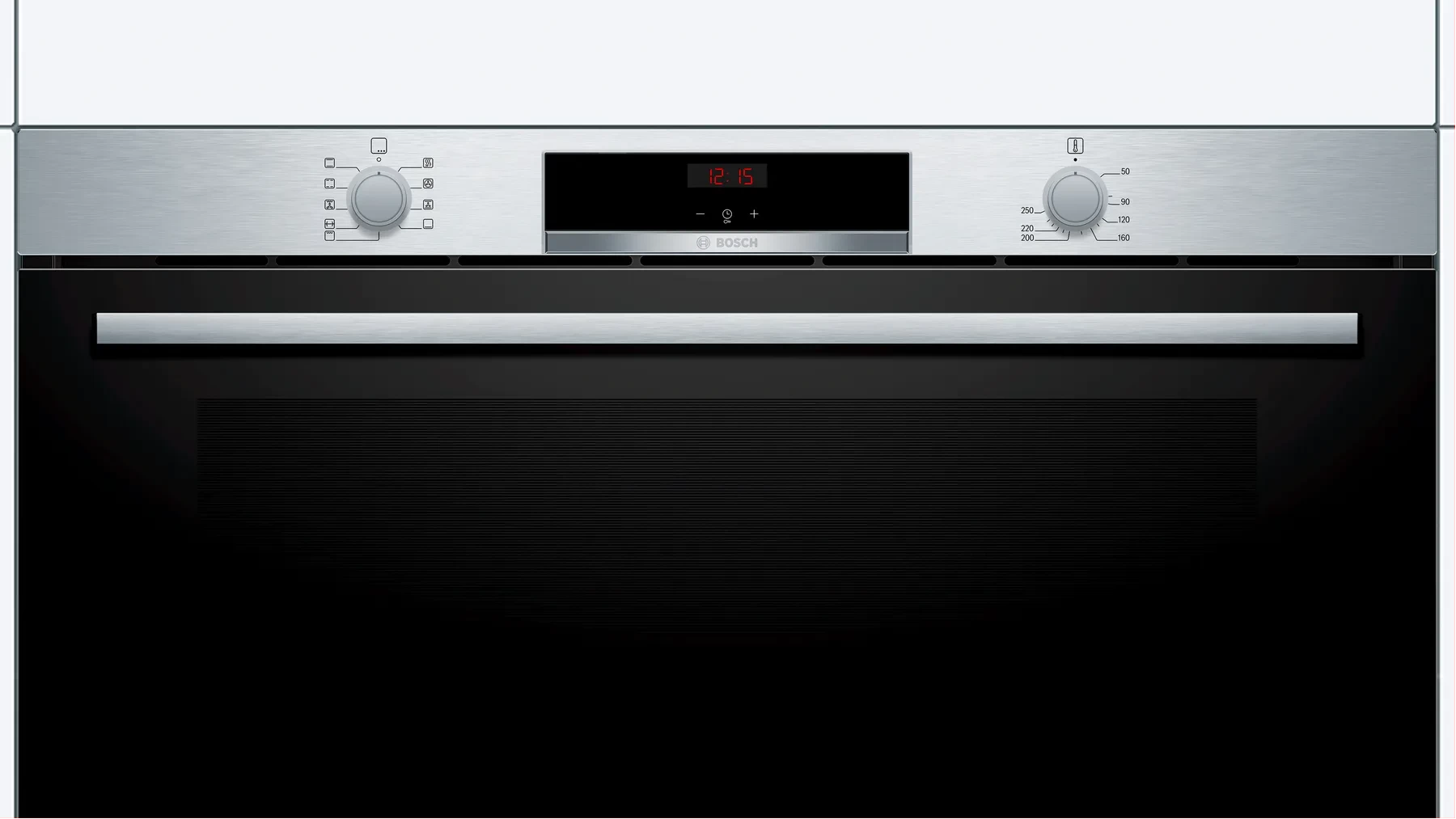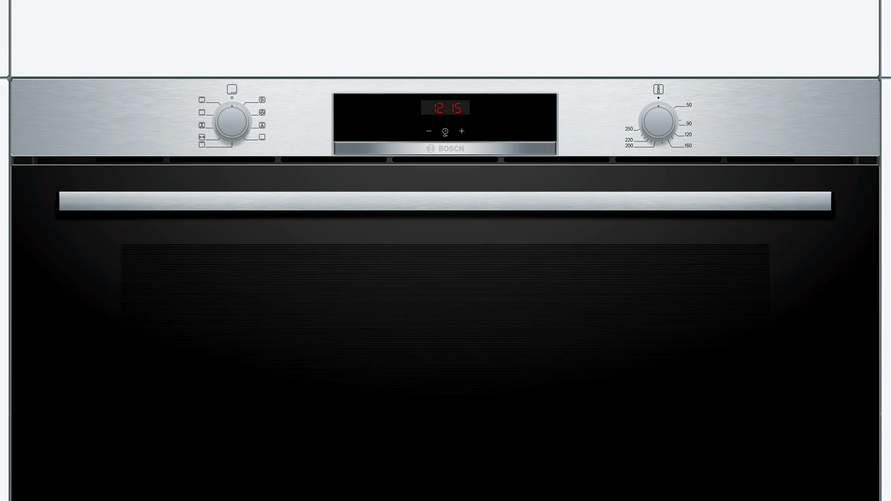 Key Features: Bosch 90cm Built In Electric Oven, VBC514CR0 (85 Litres, 90x48cm). The 90cm built-in oven: offers you the enough space for larger dishes Hotair: perfect results on two levels thanks to optimal distribution of heat LED display control, red: easy-to-use thanks to the time functions Electronic clock, Elongated halogen light, – Integral cooling fan, Extra large capacity oven with grey enamel
