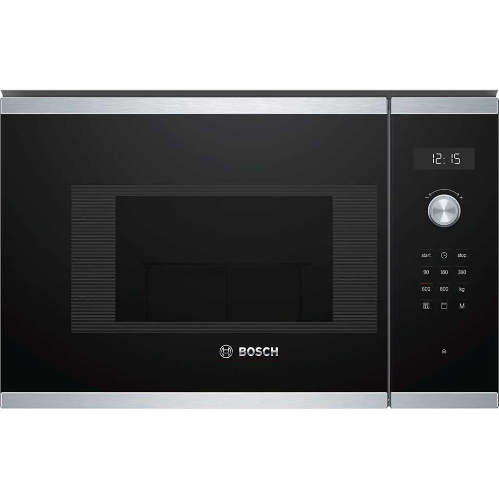 Bosch BEL524MS0 Series 6 Integrated Built-in Microwave, 60 x 38 cm, 20 Litres, White Bosch BEL524MS0 Series 6 – Built-In Microwave, 60 x 38 cm, 20 L, White Product Description The Bosch BEL524MS0 Microwave has a large cavity of 25 litres which is suitable for large food. These removable buttons allow easy adjustment of the 5 available power levels. The elegant design allows you to easily blend in. Product features: display LED retractable buttons, push pull buttons, touch control control, main features: volume 25L, 5 microwave power: 90W, 180W, 360W, 600W, 900W, 7 automatic programs, 4 defrosting and 3 in microwave function, memory function (1 position) comfort turntable glass: 31 5 cm. Electronic clock, LED lighting, cavity lighting. Left hinges Opening of the electronic door. Connection cable:130cm Total connection power:1.45KW Rated voltage 220-230V. Bosch has made the task of making life easier by providing reliable, efficient and comfortable equipment. Bosch was founded in 1886 when Robert Bosch opened its first engineering workshop in Stuttgart, Germany. Decades later, the brand has established itself as a reference for household appliances and used with the ever recognised quality. Bosch Technologies for Life