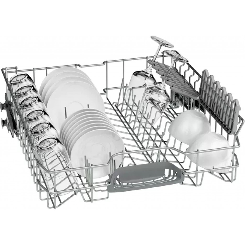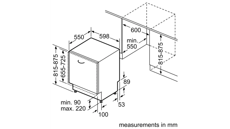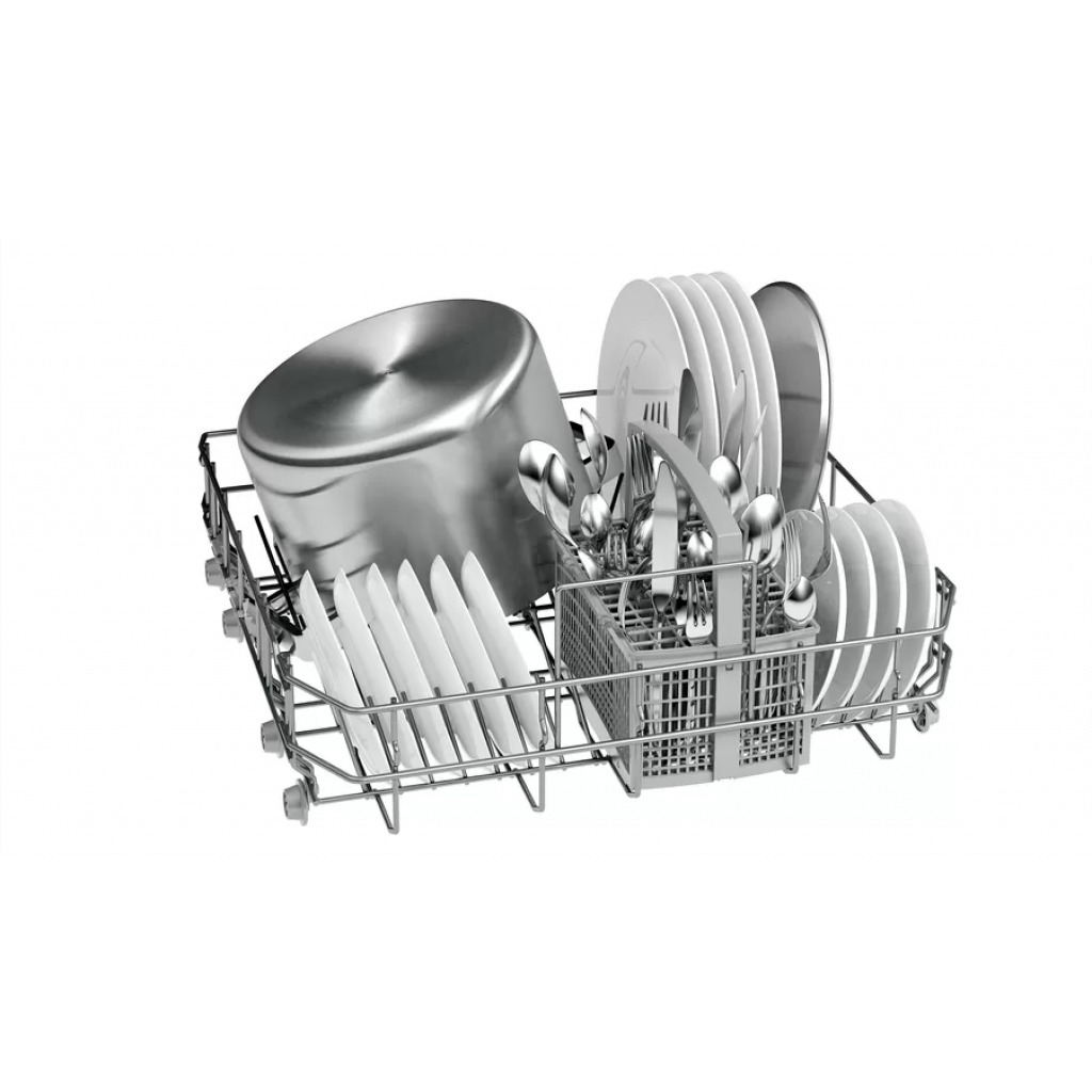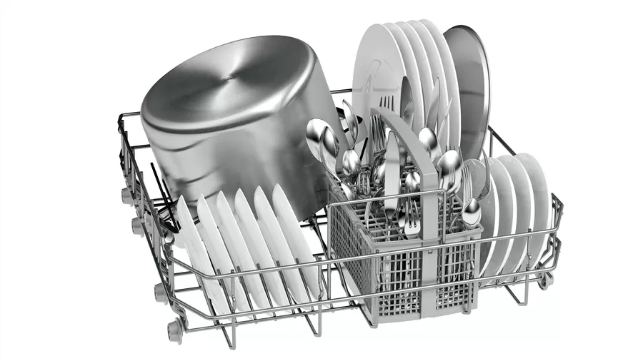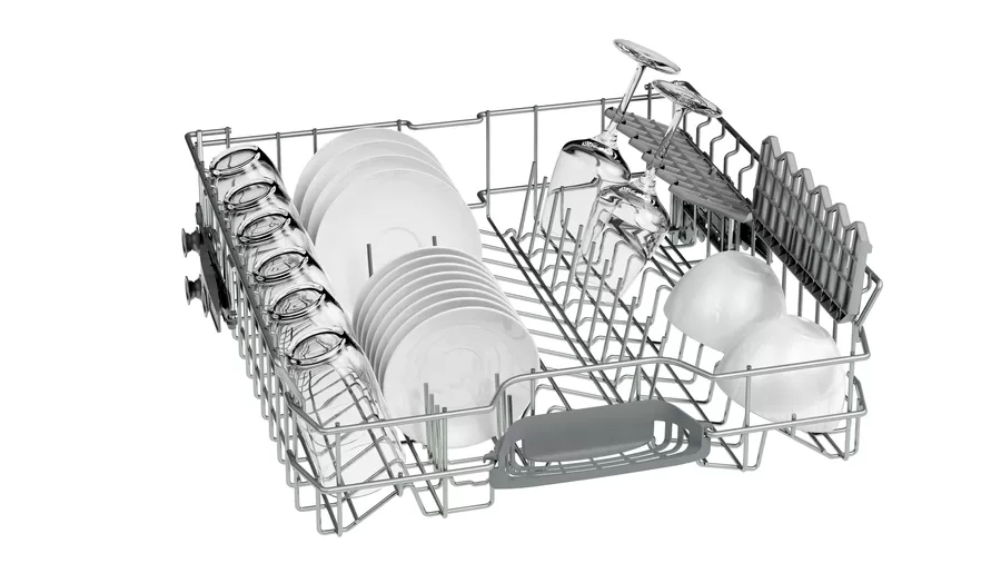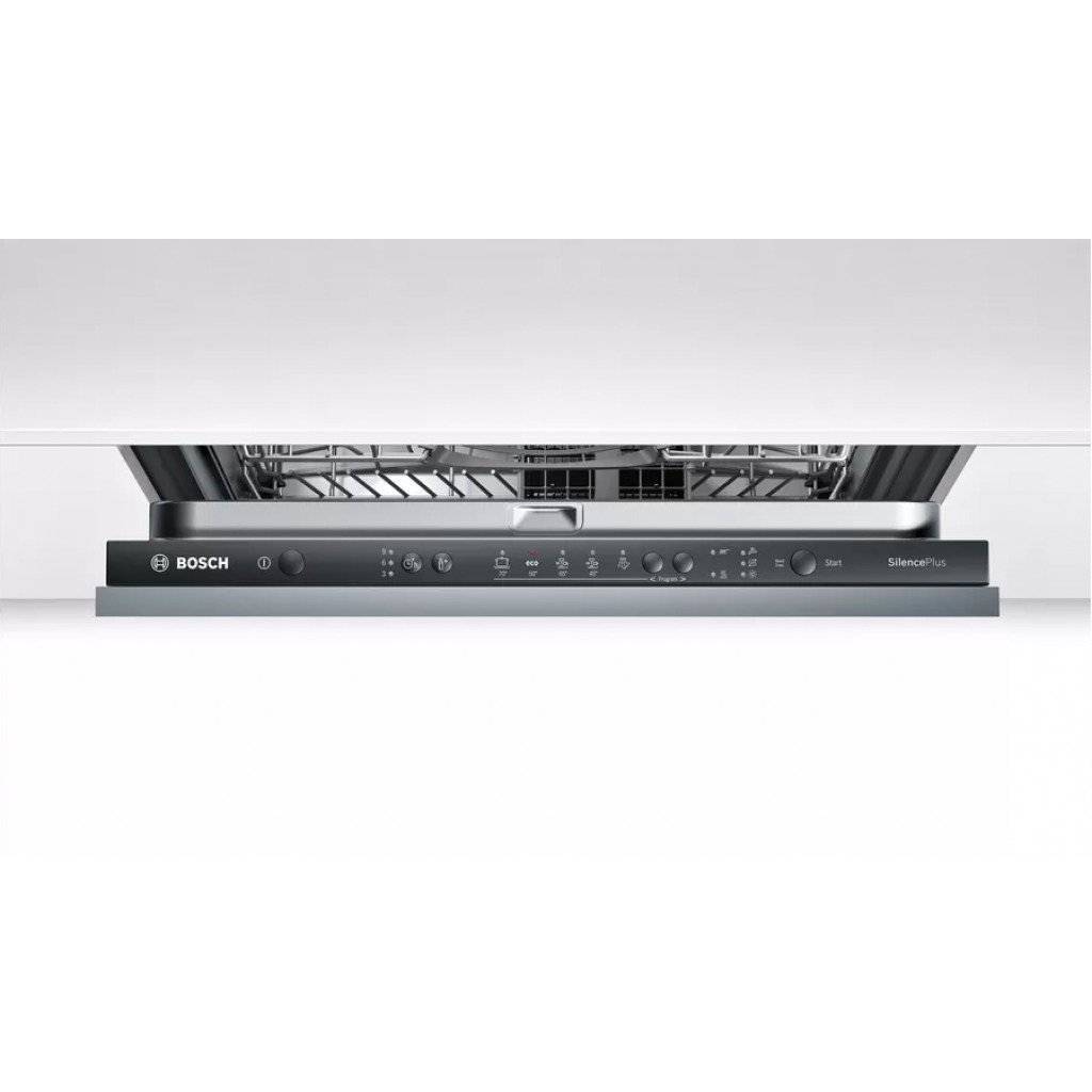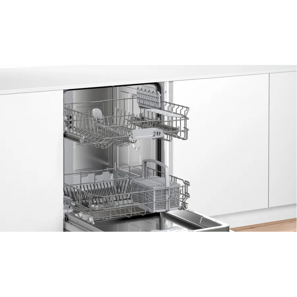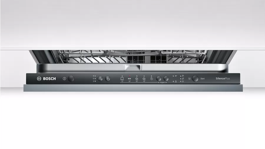 Bosch Serie 4 60 cm, Built- in, Fully-Integrated Dishwasher, 5 programs, 12 Place settings | SMV50E00GC Brand Name Bosch Model Info SMV50E00GC Product Dimensions 55 x 60 x 82 cm; 32 Kilograms Capacity 12 Place Settings Annual Energy Consumption 402 Kilowatt Hours Per Year Noise 48 dB Part Number SMV50E00GC Form Factor Built-In Color White Control Console Fully Integrated Voltage 240 Volts Included Components No Batteries Required? No Item Weight 32 kg HygienePlus option: Rinsing with higher temperatures for highest hygienic performance. HygienePlus is a new option that can be activated in many programmes, and ensure maximum hygiene thanks to antibacterial cleaning. This effect is achieved by a higher temperature level of up to 70°C during rinsing, sustained for approximately 10 minutes. HygienePlus is therefore ideal for people with high hygiene standards, for instance in households with small children or allergy sufferers. DosageAssist ensures optimum results thanks to effective dissovlving of the cleaner tab. The DosageAssist ensures optimal cleaning results and a quieter wash. The detergent drops out the detergent dispenser and into a special tray on the top basket where it gets completely dissolved. EcoSilence DriveTM: powerful, durable, quiet and efficient To increase our cleaning efficiency we have developed the economical EcoSilence DriveTM. It is exceptionally quiet, efficient and ensures low electricity consumption. The EcoSilence DriveTM works without brushes is ultra silenct and top results are automatically guaranteed. Less water, less energy, better performance. Bosch’s innovative ActiveWater technology maximises efficiency to produce outstanding results whilst protecting the environment. With carefully targeted water distribution, improved filter technology, faster heating and increased pump output for more water circulation, ActiveWater dishwashers give superb results.