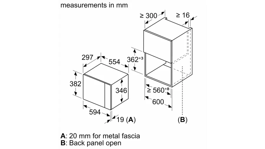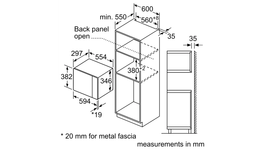 Key Features: Bosch Serie 4 Built-in 20 – Litres Microwave Oven With Grill 60 x 38 cm BEL523MS0B – Stainless Steel 20 litre capacity – great for small households 800 Watt power output – for fast cooking 8 automatic programmes to cook food to perfection Grill function is perfect for quick snacks Dimensions (cm) H38.2 x W59.4 x D31.7