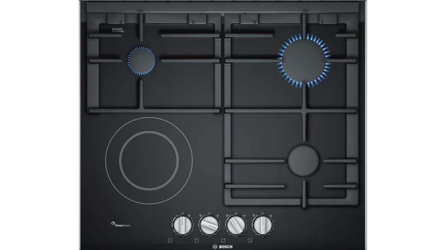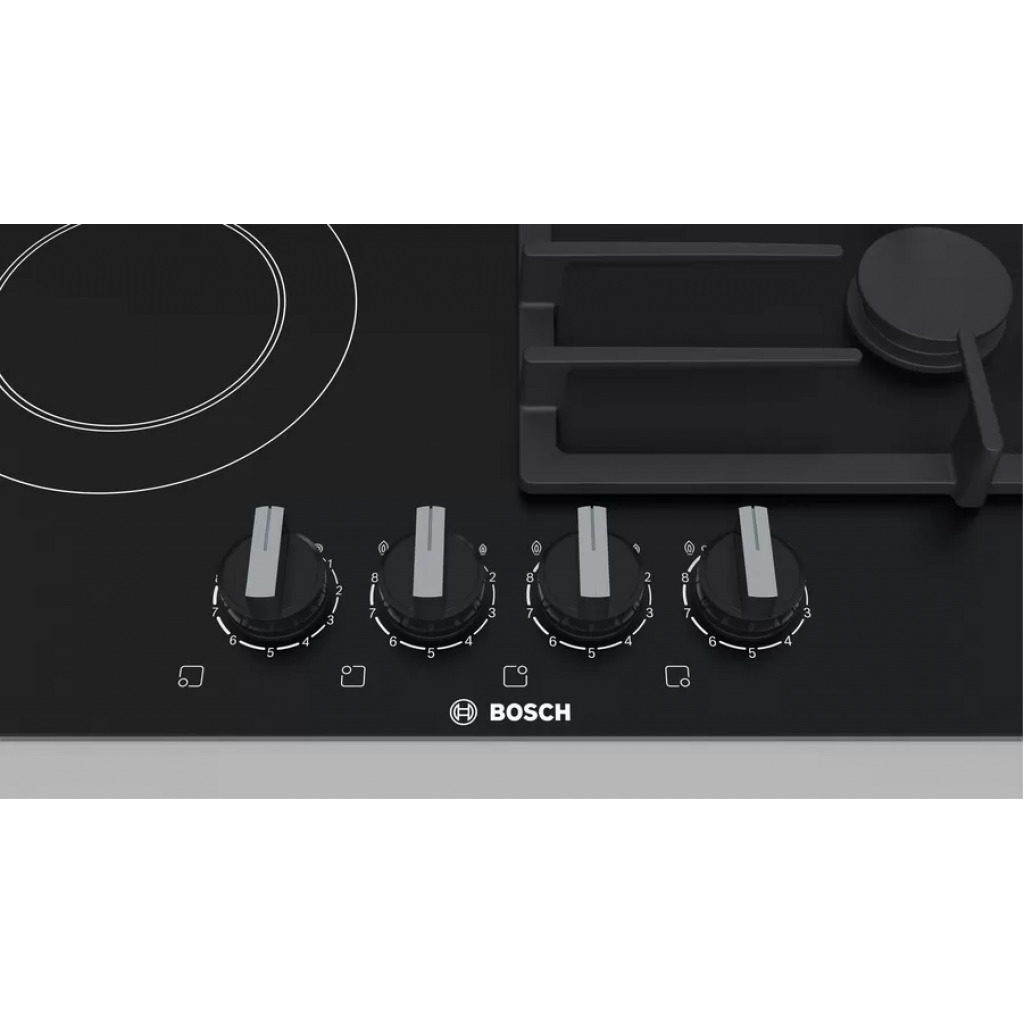 Key Features: Bosch PRY6A6B70 3 Gas +1 Electric Built In Hob, 60cm, Front Knobs – Black 3 gas burners and 1 electric cooking zone 1 high speed, 1 standard, 1 economy burner, 1 hotplate 1-hand ignition Flame failure safety device 1 stage residual heat indicator Black cast iron pan supports Electrical cable length 1 m