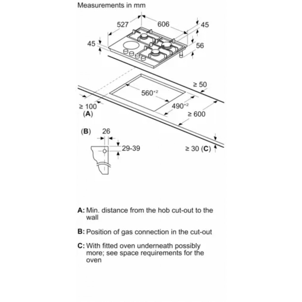 Bosch PRY6A6B70 Serie 8 60cm Ceramic 3 Gas + 1 Electric Built In Hob 3 Gas burner 1 High Speed 2.8kW 1 Standard 1.8kW 1 Eco burner 1.1kW 1 Electric dual circuit zone FlameSelect Digital display to indicate selected power level Electronic ignition via front controls 4-fold residual heat indicator Flame failure device Cast iron pan supports (dishwasher safe) HEZ298105 Simmer Plate : Accessory Overall: (H x W x D): 4.5 x 60.6 x 52.7cm Aperture: (H x W x D): 4.5 x 56.0-56.2 x 49.0-50.2cm Rating: 1800W