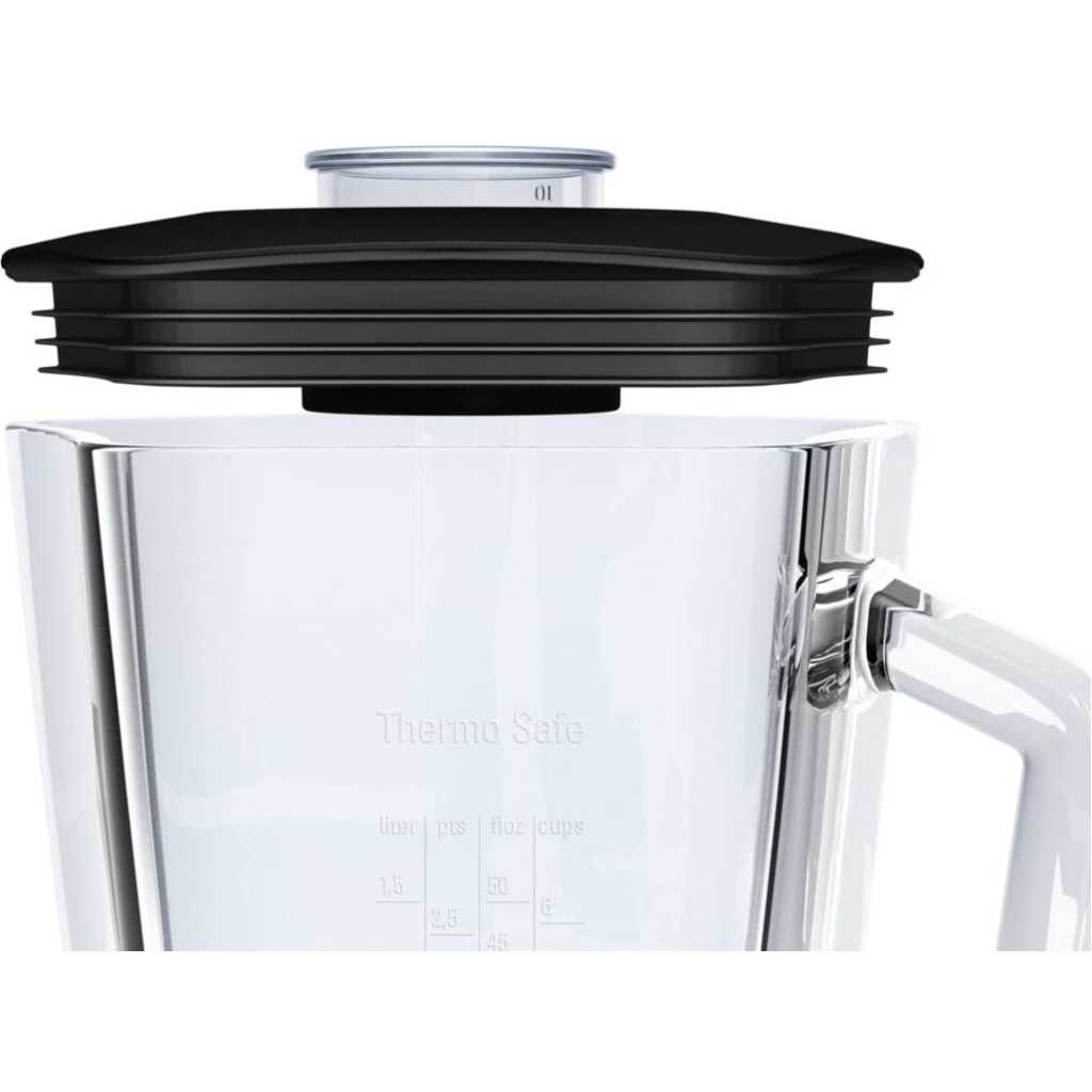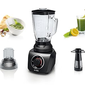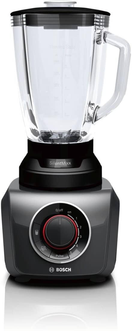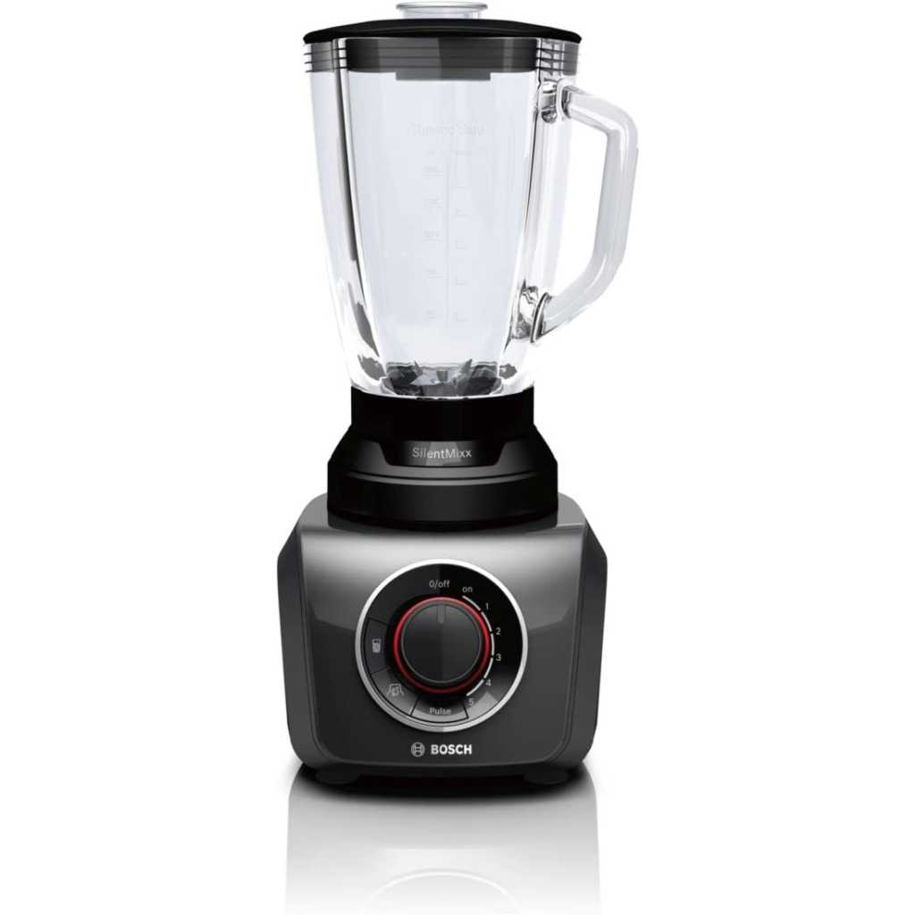 Bosch SilentMixx MMB43G3BGB Blender 700 W, 1.5 Litre – Black The Bosch SilentMixx chops, mixes and blends ingredients of your choice quickly, reliably and, above all, more quietly than other blenders. With a ThermoSafe glass jug (2.3 Litre) allowing you to mix hot soups and ice-cold drinks safely. Using the VitaBar App, it offers the perfect inspiration for your healthy lifestyle with lots of recipes Box Contains 1 x Bosch MMB43G3BGB SilentMixx Blender 1 x 1.5 L glass jug 1 x Smoothie filter 1 x 400 ml chopper attachment 1 x 50 ml measuring cup