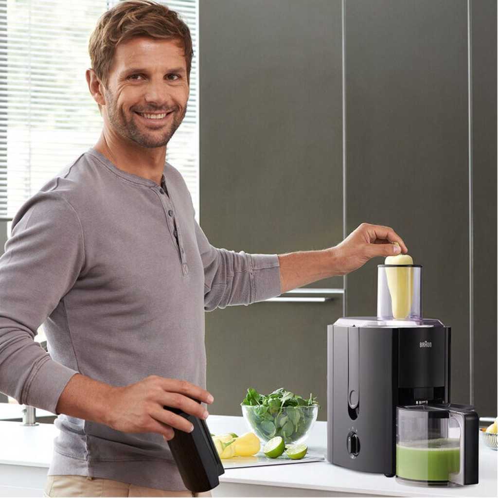 Key Features: Braun J300 IdentityCollection Spin Juicer | 800W Juice Extractor. 2 speeds to process both soft and hard fruits Anti-splash spout enables the juice to flow vertically into the glass Pulp container which is ergonomic and easy to remove 4-way safety means if one of the security conditions is not met the motor will stop within 3 seconds Fast juicing at only 15 seconds to enjoy one glass of juice 2L pulp Container
