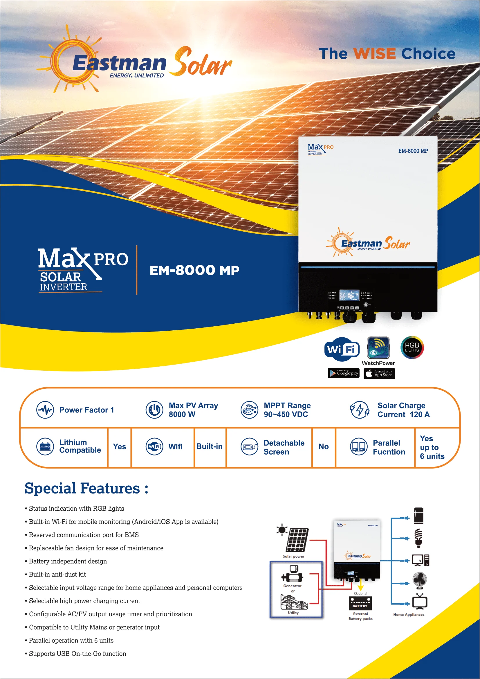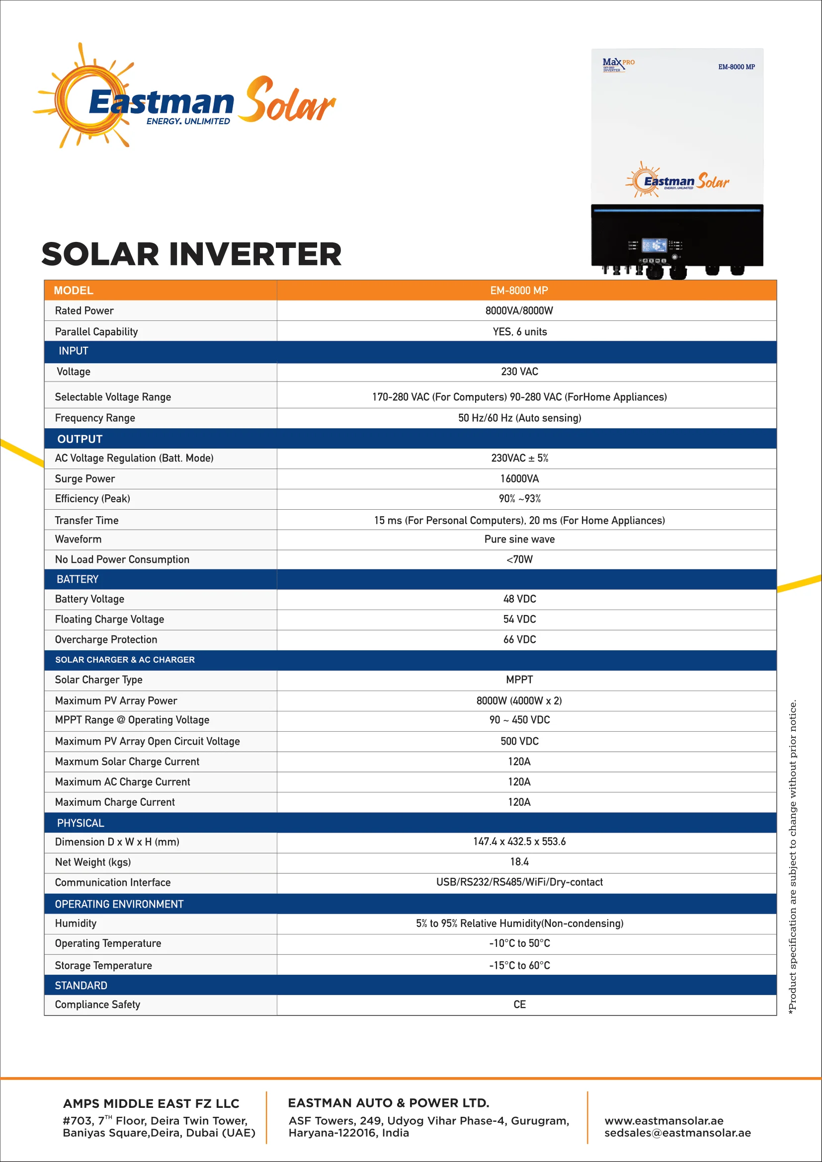 Description Eastman 8kVA/8kW 48V Off-Grid Hybrid Solar Inverter EM-8000 MP