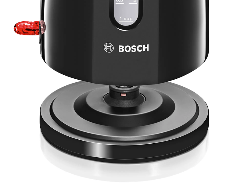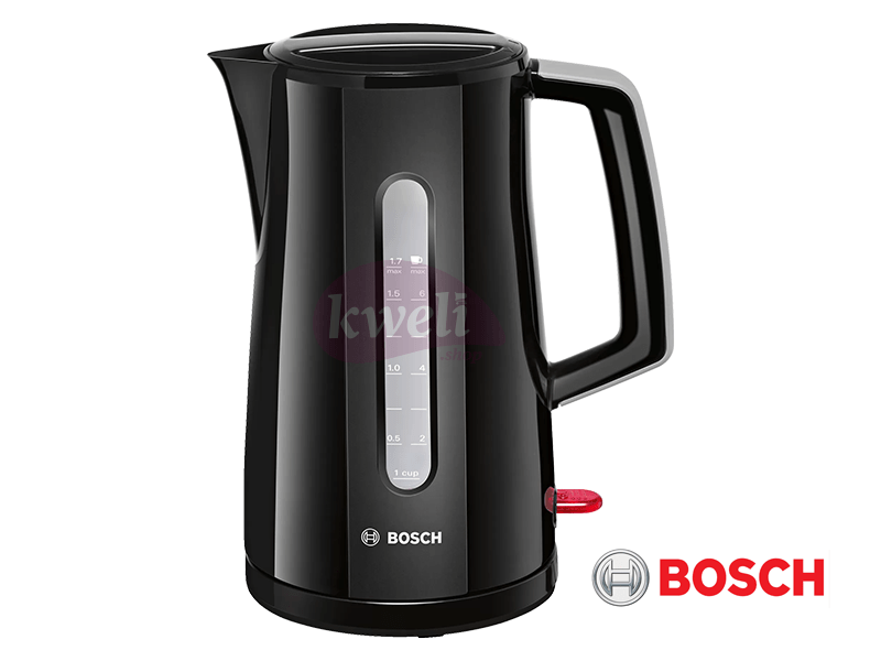 BOSCH Electric Kettle Specs: 1.7-liter capacity 1 cup (0.25l) min. fill Wattage: 2500-3000W Stainless steel interior base with a concealed heating element Removable limescale filter Cordless, 360º rotary base large water window: good visibility for right and left-handed persons Easy filling through spout - no need to open the lid Large opening for easy cleaning Safety locking lid Lighted on-off switch Automatic switch-off: kettle automatically switches off when the water has boiled Lift switch off: the kettle automatically switches off when removed from its base Boil-dry and overheat protection Non-slip feet on the base Easy storage: Cord keeper for simple and quick storage of the cable | #KweliGotYou| Order Bosch Electric Kettle, 1.7-liter, 2500-3000 watts, Black - TWK3A033GB online and enjoy free delivery across Uganda > Long warranty > Lifetime After-sales Support