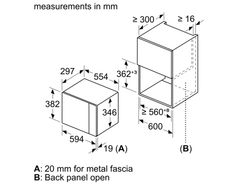 Bosch Series 6 Built-in Microwave Oven BFL524MS0B Automatic safety switch off Door contact switch AutoPilot, 7 LED light Integral cooling fan Electronic open button LED Display, white Side opening door, left hinged 25.5cm Glass turntable Cavity inner surface: Stainless steel Electronic clock timer Rotary dial, Retractable control dials, Touch controls, round, Start button Touch key operation Maximum microwave power level: 800 W and the following options 180 W, 360 W, 600 W, 800 W, 90 W 4 defrost and 3 cooking programmes in microwave function 1 memory setting Cavity volume: 20 l 130 cm Cable length Total connected load electric: 1.27 KW Nominal voltage: 230 – 240 V Appliance dimension (HxWxD): 382mm x 594mm x 317mm Niche dimension (HxWxD): 362mm – 365mm x 560mm – 568mm x 300mm For installation into a 60 cm wide wall unit, installation in tall housing Please refer to the dimensions provided in the installation manual Accessories: 1x Turntable