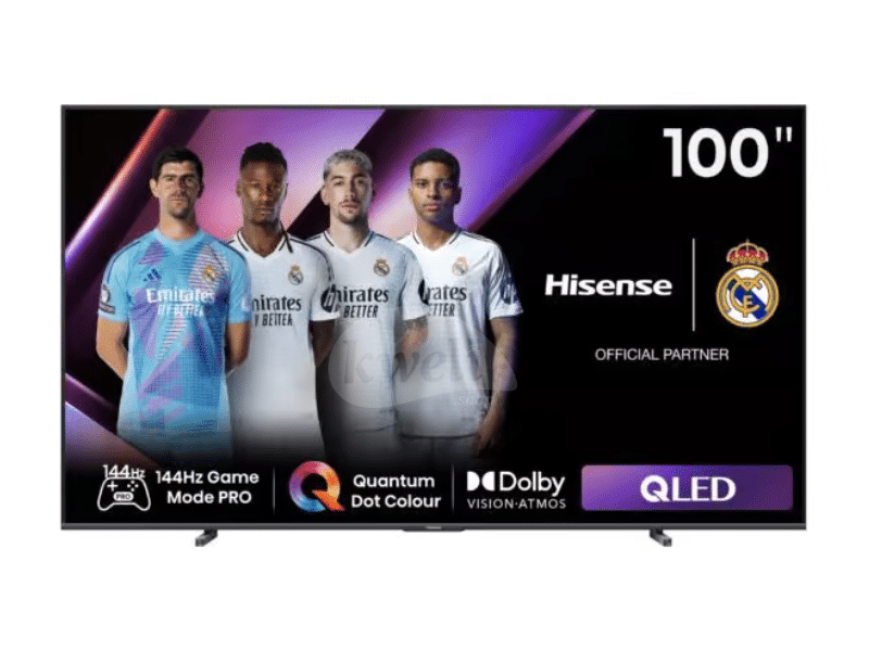 Description Hisense 100-inch QLED 4K UHD Smart TV 100Q7N Immerse yourself in boundless entertainment with the Hisense 100″ QLED 4K Smart TV 100Q7N! Featuring Quantum Dot Colour, 144Hz Refresh Rate, Game Mode PRO, Dolby Vision IQ & Atmos, and a built-in subwoofer, it’s designed for epic gaming, cinematic visuals, and premium audio in a sleek frameless design.