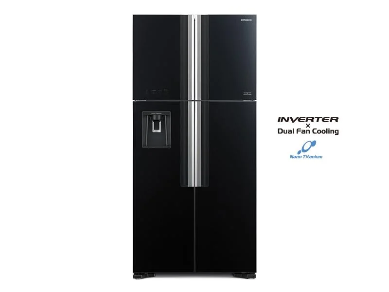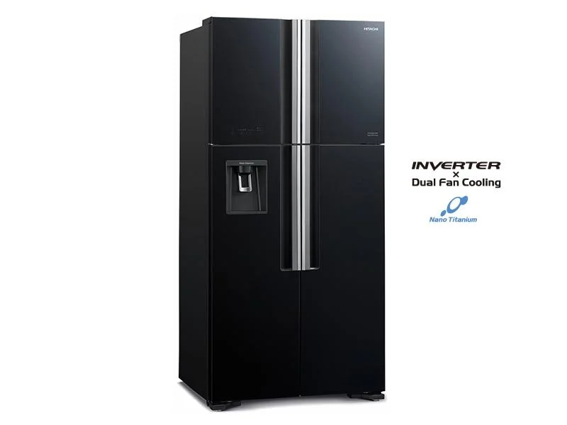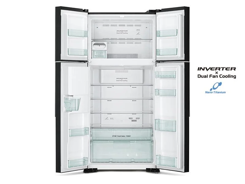 Description Hitachi 4 Door Fridge with Water Dispenser, Glass Black – RW660PUN7GBK Inverter Technology Compressor: Depending on the conditions inside the refrigerator and the outdoor environment, the Inverter compressor adjusts the cooling intensity to the appropriate level for optimal cooling at all times. INVERTER X Dual Fan Cooling The Hitachi Solution for Powerful Refrigeration Plus Exceptional Energy Saving. Fresh Select The Select Lever lets you adjust the inside temperature by switching between the two modes.