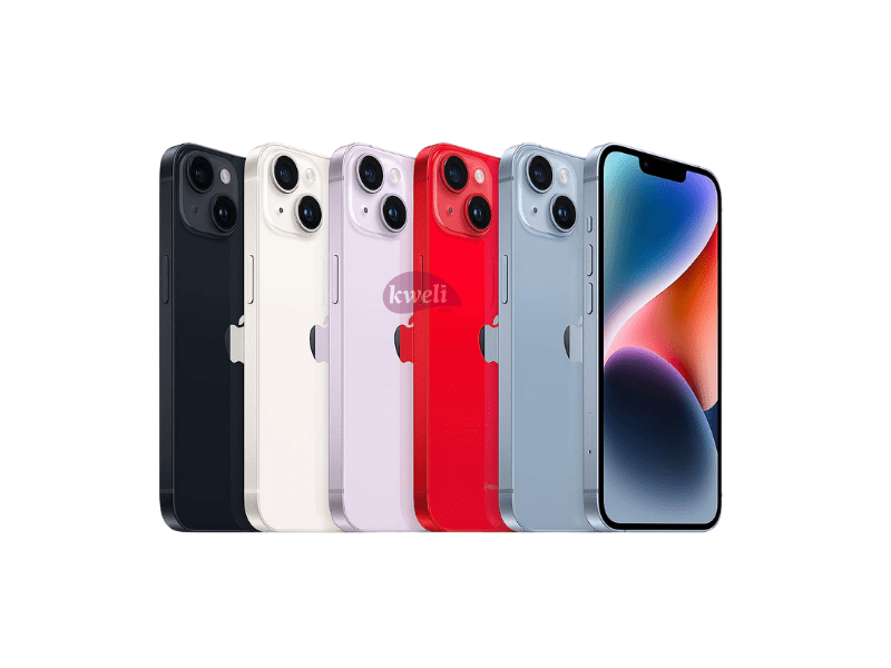 iPhone 14; 6GB, 128GB Super Retina XDR display 6.1‑inch (diagonal) all‑screen OLED display 2532‑by‑1170-pixel resolution at 460 ppi Operating system; iOS 16 Colours: Midnight, Starlight, (PRODUCT) RED, Blue, Purple, Yellow Ceramic Shield front Glass back and aluminium design Weight: 172 grams (6.07 ounces) Memory: 6GB RAM, Storage: 128GB ROM HDR display True Tone Wide colour (P3) Haptic Touch 2,000,000:1 contrast ratio (typical) 800 nits max brightness (typical); 1200 nits peak brightness (HDR) Fingerprint-resistant oleophobic coating Support for display of multiple languages and characters simultaneously Splash, Water, and Dust Resistant; Rated IP68 (maximum depth of 6 meters up to 30 minutes) under IEC standard 6052 Camera Dual-camera system 12MP Main: 26 mm, ƒ/1.5 aperture, sensor‑shift optical image stabilization, seven‑element lens, 100% Focus Pixels 12MP Ultra Wide: 13 mm, ƒ/2.4 aperture and 120° field of view, five‑element lens 2x optical zoom out; digital zoom up to 5x Video Recording 4K video recording at 24 fps, 25 fps, 30 fps, or 60 fps 1080p HD video recording at 25 fps, 30 fps, or 60 fps 720p HD video recording at 30 fps Cinematic mode up to 4K HDR at 30 fps Action mode up to 2.8K at 60 fps HDR video recording with Dolby Vision up to 4K at 60 fps TrueDepth Camera 12MP camera ƒ/1.9 aperture Autofocus with Focus Pixels Six‑element lens Face ID Enabled by TrueDepth camera for facial recognition Apple Pay Safety Li-Ion 3279 mAh non-removable battery | #KweliGotYou| Order iPhone 14; 6.1‑inch, 6GB RAM, 128GB Memory, 5G, iOS 16, 3279 mAh Battery, Dual Camera, 12MP + 12MP Camera online and enjoy free delivery across Uganda > Long warranty > Lifetime After-sales Support