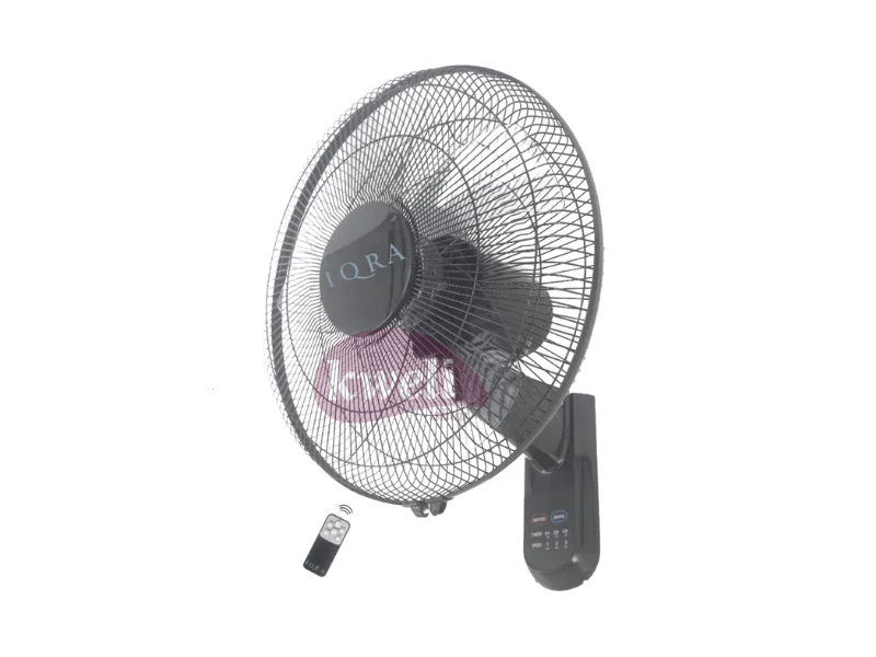 Description IQRA 16-inch Wall Fan with Remote Control IQ-WF019R 50W copper motor for strong, energy-efficient performance Remote control for convenience and easy operation Quiet and vibration-free design 5-blade structure delivers smooth, steady airflow Timer function for up to 4 hours of automatic shutoff Space-saving wall-mounted installation