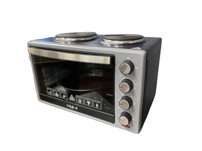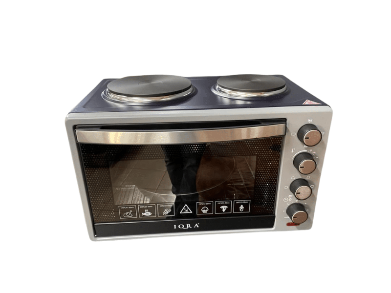 Description Iqra 30L Premium Electric Oven with Hot Plates IQ-EO38HP Your all-in-one cooking companion! With 30L capacity, dual hot plates, rotisserie, and multiple trays, this oven is built for versatility — from baking and roasting to cooking full meals at once.