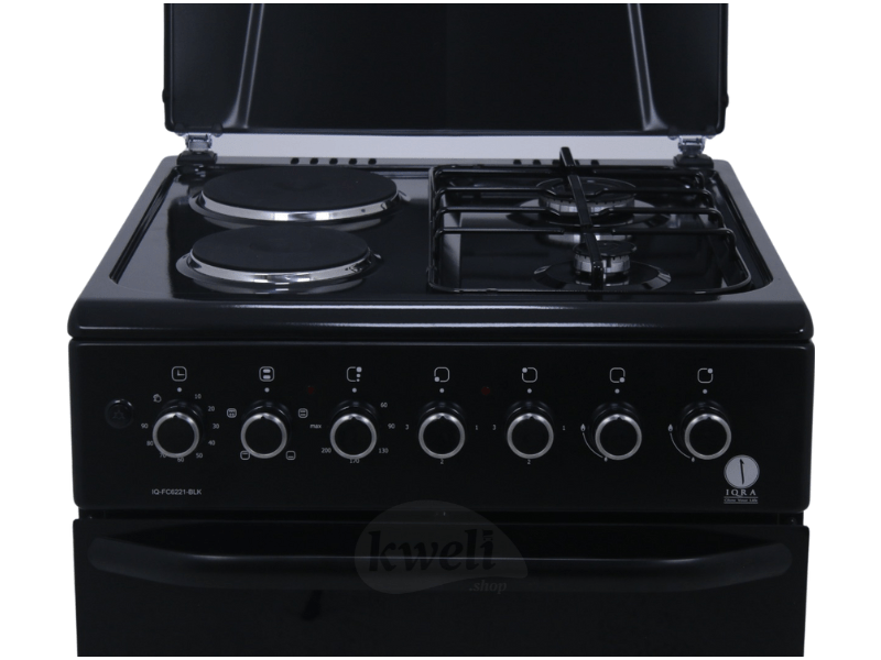 Buy new IQRA 60cm Cooker IQ-FC6221-BLK; 2 Gas Burners + 2 Electric Plates, Electric Oven and Grill, Timer, Enamel Pan Support, Black in Uganda - - Free Delivery > Long warranty > Lifetime After-sales