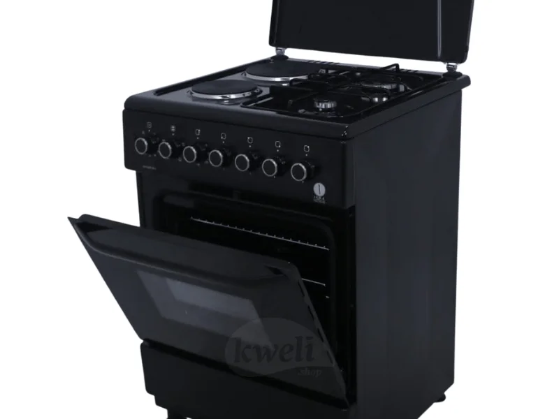 IQRA 60cm Cooker IQ-FC6221-BLK 2 Multigas (Euro Type Pool) Burners + 2 HP (1000 Watts and 1500 Watts) WxDxH: 60x60x85cm Electric Oven with Up and Down Heating Elements Thermostat, Electric Grill, Enamel Pan Support, Push Button Ignition for Hob Burners, Metallic Top Lid, Oven Lamp, Rotisserie, Timer, Cool Door II (Removable inner Glass), 1 Oven Tray, 1 Oven Grid, Adjustable Feet, Colour: black 1-year warranty | #KweliGotYou| Order IQRA 60cm Cooker IQ-FC6221-BLK; 2 Gas Burners + 2 Electric Plates, Electric Oven and Grill, Timer, Enamel Pan Support, Black online and enjoy free delivery across Uganda > Long warranty > Lifetime After-sales Support